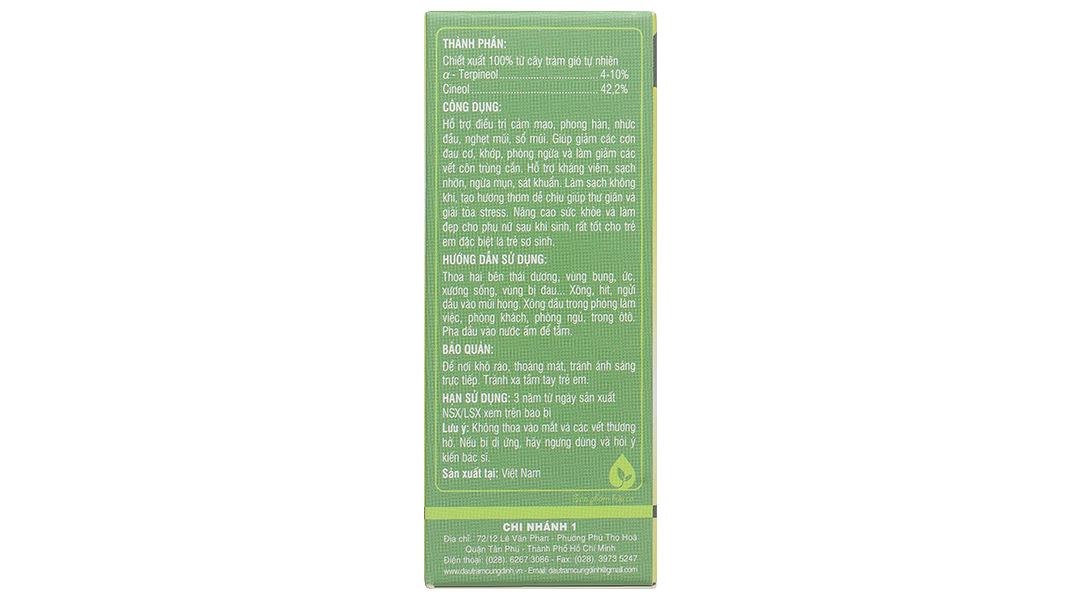 Thành phầnα-Terpineol (4 - 10%), Cineol (42.2%)