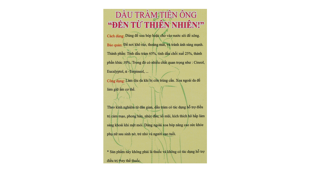 Sản Phẩm Dầu Tràm Tiên Ông tự hào là thương hiệu duy nhất đúc kết được những kinh nghiệm chưng cất tinh dầu truyền thống quý giá của cha ông đã tồn tại hơn 100 năm qua, kết hợp với việc ứng dụng những phương pháp chiết xuất hiện đại để tạo nên một sản phẩm Dầu Tràm Tiên Ông hoàn hảo.