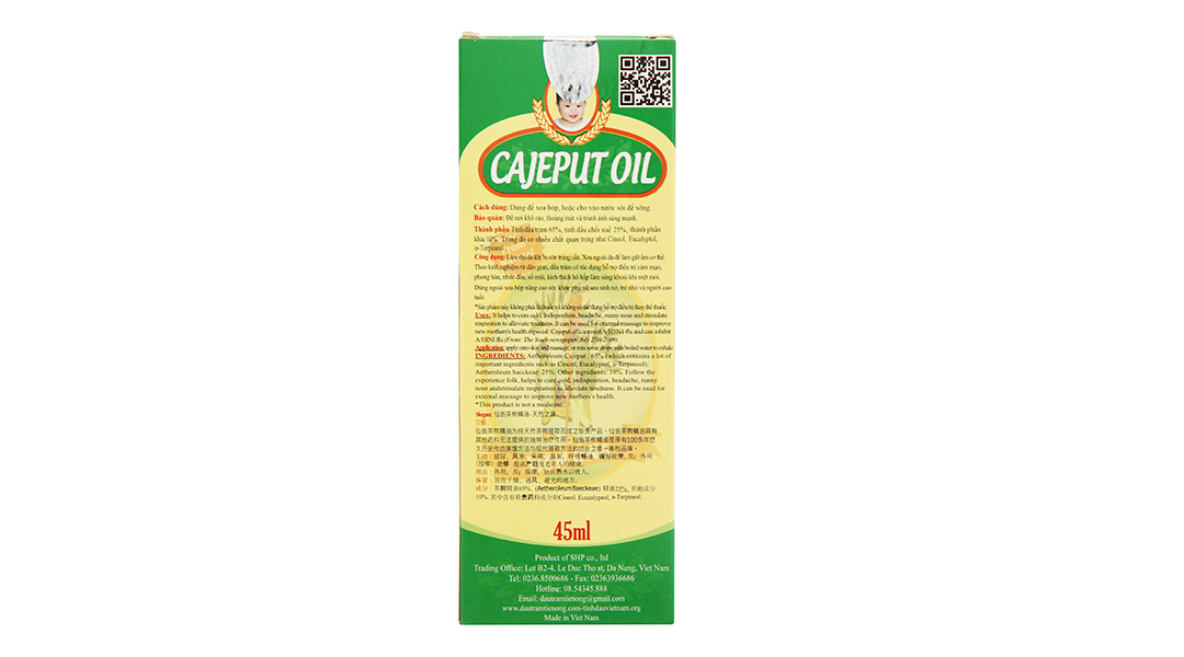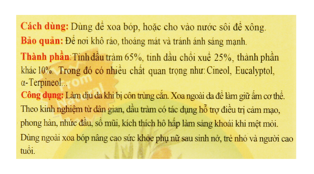 Tinh dầu tràm 65%, tinh dầu chổi xuể 25%, thành phần khác 10%. Trong đó có nhiều chất quan trọng như: Cineol, Eucalyptol, L-Terpineol,…