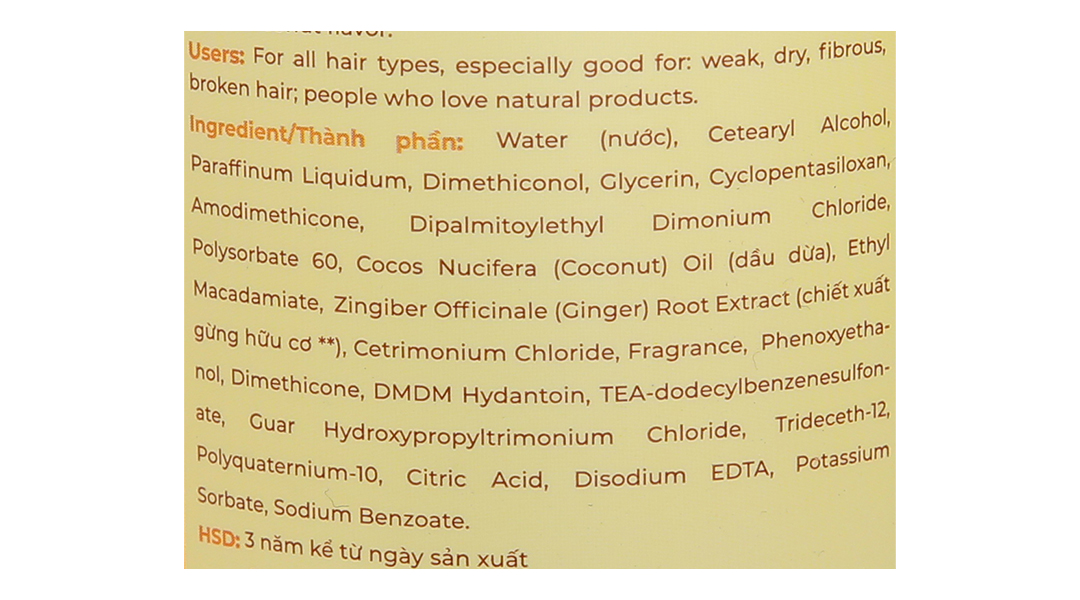 Thành phầnGừng tươi và dầu dừa, chiết xuất từ nho, lá olive, dầu argan, vitamin B5