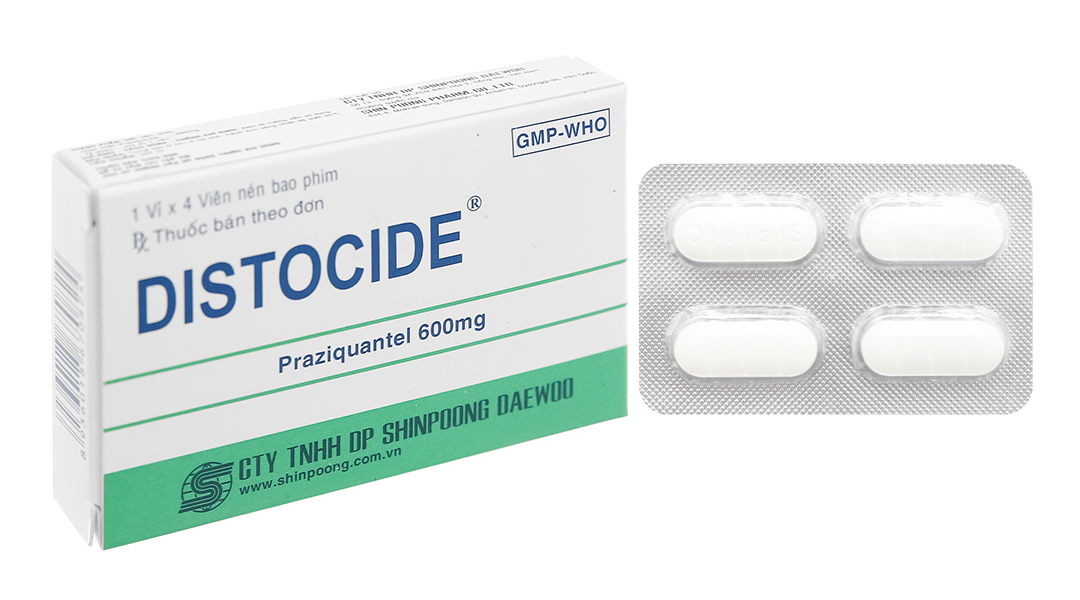 - Ở người: Thuốc được hấp thu nhanh khi uống, ngay cả khi uống trong bữa ăn, trên 80% liều dùng được hấp thu, đạt nồng độ đỉnh sau khi uống từ 1 – 3 giờ, gắn với protein huyết tương là 80 – 85%. Thuốc được phân bố trong toàn bộ cơ thể sán. Ở người, nồng độ thuốc trong dịch não tủy bằng 15 – 20% nồng độ trong huyết tương.