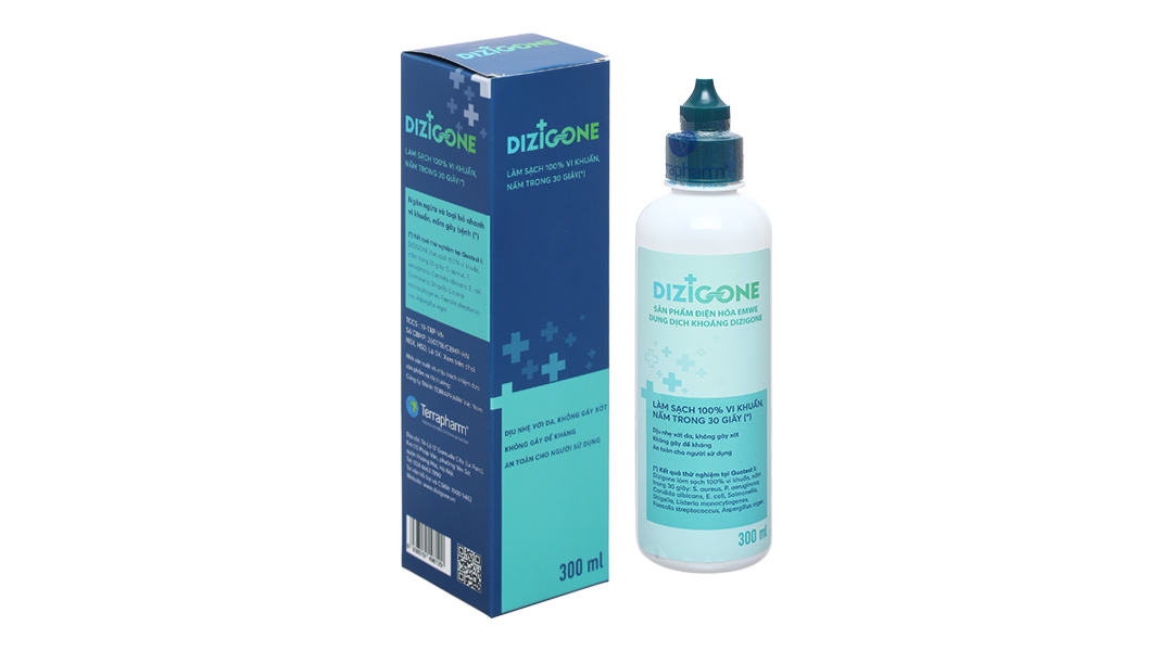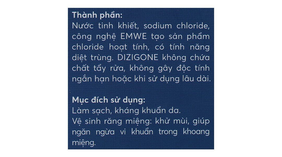 Nước tinh khiết, sodium chloride, công nghệ EMWE tạo sản phẩm chloride hoạt tính, có tính năng diệt trùng. DIZIGONE không chứa chất tẩy rửa, không gây độc tính ngắn hạn hoặc khi sử dụng lâu dài.