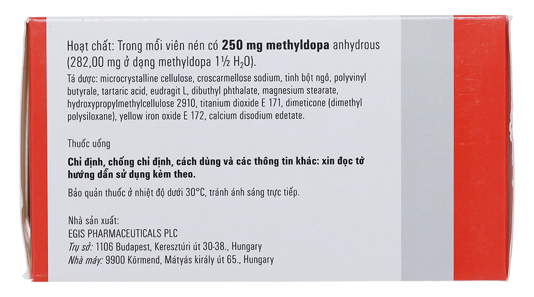 Hoạt chất: Trong mỗi viên nén bao phim có 250mg methyldopa anhydrous (282,00mg ở dạng methyldopa 1 ½ H2O).