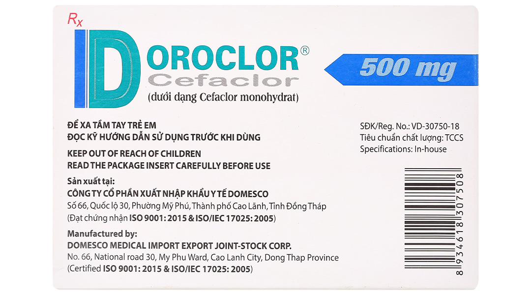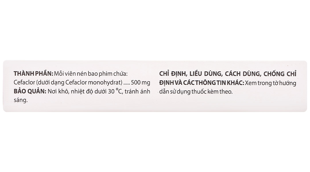 - Thành phần dược chất: Cefaclor (dưới dạng Cefaclor monohydrat) 500mg.