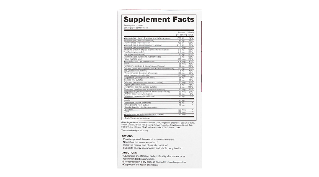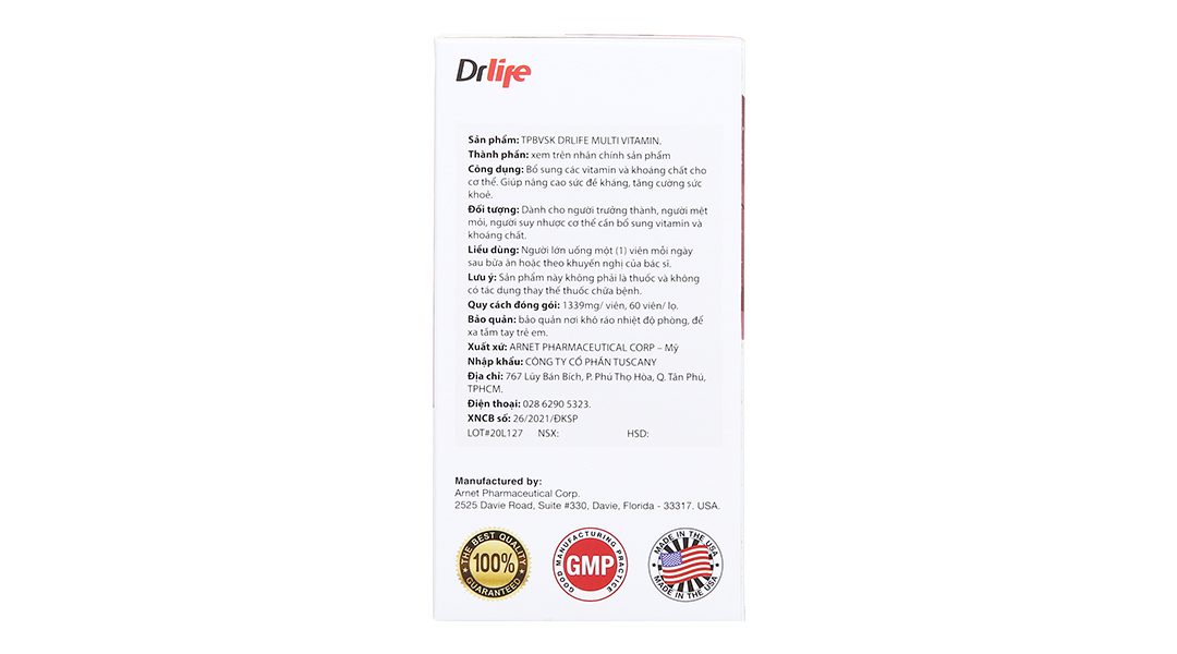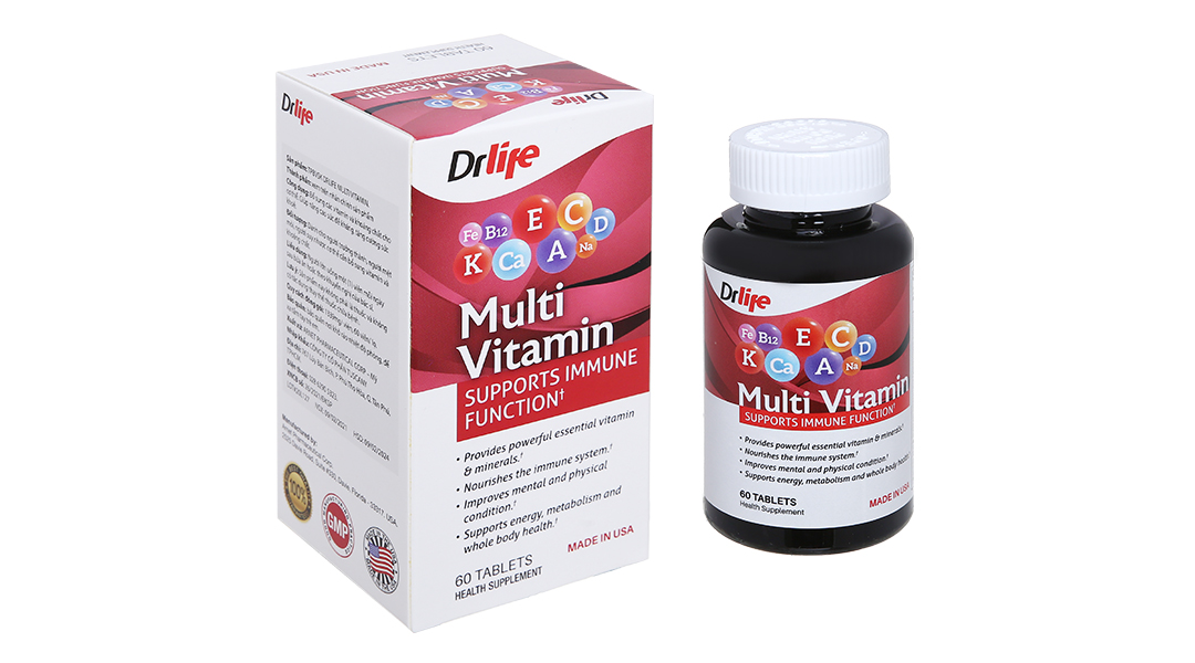 - Drlife Multi Vitamin là sản phẩm bổ sung vitamin và khoáng chất đến từ Arnet Pharmaceutical Corp, được sản xuất theo quy trình chuẩn GMP và đạt chứng nhận FDA Hoa Kỳ, cam kết mang lại chất lượng tuyệt vời và hiệu quả cao. Với một công thức chứa đầy đủ các vitamin và khoáng chất thiết yếu như canxi, photpho, vitamin C, magie, niacin, nhân sâm, và nhiều thành phần khác, giúp bổ sung dưỡng chất cần thiết cho cơ thể, hỗ trợ duy trì sức khỏe và cải thiện sức đề kháng. Những thành phần như vitamin C và E có tác dụng mạnh mẽ trong việc chống oxy hóa, bảo vệ tế bào khỏi các tác nhân gây hại từ môi trường, trong khi nhân sâm và inositol giúp tăng cường sức khỏe thể chất và tinh thần.