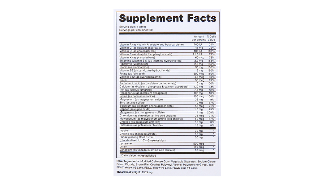 Thành phần phụ: Keo cellulose biến đổi, Stearates thực vật, natri citrate, Silicon dioxit, màng phủ màu nâu: polyvinyl alcohol, polyethylene glycol, talc, FD&C vàng #6, FD&C vàng #5 lake, FD&C xanh #1 lake.