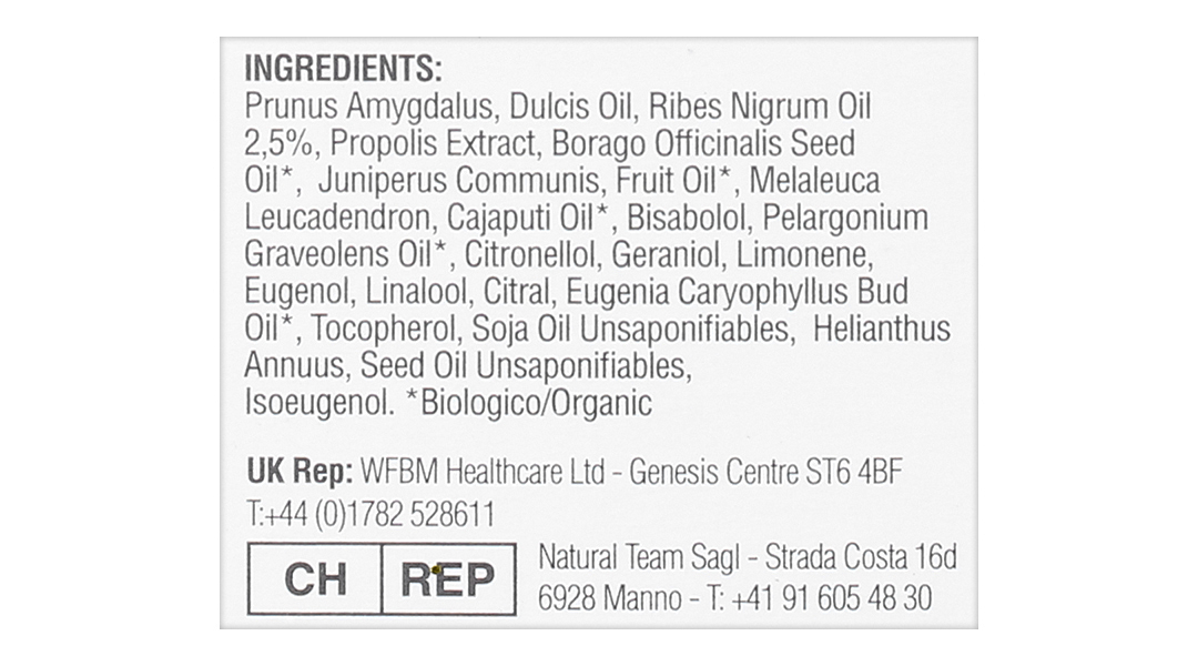 Thành phầnTinh dầu hạnh nhân, tinh dầu lưu ly, dầu lý chua đen, tinh dầu cây tùng, tinh dầu hoa phong lữ, tinh dầu đinh hương, bisabolol, chiết xuất keo ong, tinh dầu tràm, vitamin E