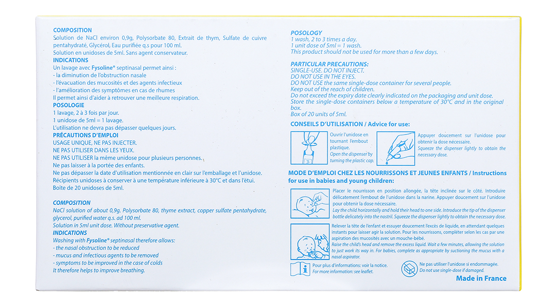 Nước muối sinh lý Fysoline Septinasal – được xem là sản phẩm chăm sóc mũi an toàn và dịu nhẹ cho trẻ, kể cả trẻ sơ sinh. Sản phẩm chứa muối sinh lý, có khả năng làm dịu mũi bị khô, kích ứng hoặc mệt mỏi do môi trường khô, viêm mũi hay sử dụng một thời gian dài, từ đó giúp giảm nguy cơ nhiễm trùng vùng mũi.