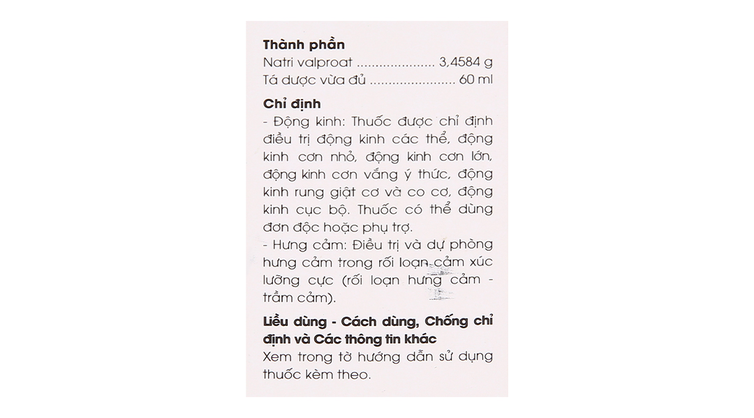 – Thai kỳ và cho con bú– Không sử dụng thuốc chứa valproat ở bé gái, trẻ vị thành niên nữ, phụ nữ trong độ tuổi sinh sản và ở phụ nữ có thai trừ khi các biện pháp điều trị khác không có hiệu quả hoặc bệnh nhân không dung nạp. Phụ nữ trong độ tuổi sinh sản cần phải sử dụng các biện pháp tránh thai có hiệu quả trong suốt quá trình điều trị. Ở phụ nữ có kế hoạch mang thai, cần cố gắng chuyển sang các biện pháp điều trị khác thay thế trước khi thụ thai, nếu có thể. – Nguy cơ liên quan tới việc phơi nhiễm với valproat trong thai kỳ: Việc sử dụng valproat dưới dạng đơn trị liệu hoặc đa trị liệu đều có liên quan đến một số bất thường trong thai kỳ. Các dữ liệu hiện có cho thấy nguy cơ dị dạng bẩm sinh khi sử dụng phác đồ đa trị liệu trong đó có thuốc chứa valproat lớn hơn so với đơn trị liệu bằng valproat. * Dị dạng bẩm sinh Các dữ liệu thu được từ một nghiên cứu gộp (bao gồm từ nguồn dữ liệu hồ sơ bệnh án và từ các nghiên cứu thuần tập) đã chỉ ra rằng 10,73% số trẻ có mẹ mắc bệnh động kinh sử dụng valproat đơn trị liệu trong thai kỳ bị dị dạng bẩm sinh (khoảng tin cậy 95%: 8,16 – 13,29). Nguy cơ bị dị tật nặng lớn hơn so với quần thể bình thường (với tỷ lệ dị tật chỉ chiếm từ 2% – 3%). Nguy cơ này phụ thuộc liều nhưng liều dưới ngưỡng vẫn chưa chứng minh được là không gây hại. Các dữ liệu hiện có cho thấy có sự tăng tỷ lệ dị tật thai nhi cả nhẹ và nặng. Loại dị dạng thường gặp nhất là dị dạng ống thần kinh, biến dạng mặt, hở hàm ếch, hẹp hộp sọ, dị tật tim mạch, thận và niệu sinh dục, dị tật ở chi (bao gồm bất sản xương quay hai bên) và đa dạng nhiều hệ cơ quan khác trên cơ thể. * Rối loạn phát triển – Dữ liệu hiện có cho thấy việc phơi nhiễm với valproat có thể dẫn tới sự bất lợi lên sự phát triển tâm thần và thể chất của trẻ bị phơi nhiễm. Nguy cơ này phụ thuộc liều nhưng liều dưới ngưỡng vẫn không loại trừ được nguy cơ. Khoảng thời gian chính xác trong thai kỳ bị ảnh hưởng bởi nguy cơ này vẫn còn chưa được xác định chắc chắn và khả năng nguy cơ xảy ra trong suốt thai kỳ không thể loại trừ. – Các nghiên cứu trên trẻ ở độ tuổi mẫu giáo từng bị phơi nhiễm valproat trong tử cung người mẹ khi mang thai đã chỉ ra rằng 30% – 40% số trẻ bị chậm phát triển trong thời kỳ đầu như chậm nói và chậm biết đi, khả năng nhận thức chậm, khả năng ngôn ngữ (đọc và hiểu) nghèo nàn và có vấn đề trí nhớ. – Chỉ số IQ được đo trên đối tượng trẻ em ở độ tuổi đi học (6 tuổi) đã từng bị phơi nhiễm valproat khi người mẹ mang thai thấp hơn trung bình 7 – 10 điểm so với nhóm trẻ từng bị phơi nhiễm thuốc chống động kinh khác. Mặc dù không thể loại trừ được vai trò của yếu tố gây nhiễu, nhưng dữ liệu hiện có đã chỉ ra rằng nguy cơ giảm sút về mặt trí tuệ ở trẻ có thể độc lập với IQ của người mẹ. – Dữ liệu đối với hậu quả lâu dài vẫn còn hạn chế. – Các dữ liệu hiện có chỉ ra rằng trẻ phơi nhiễm valproat trong tử cung người mẹ khi mang thai có nguy cơ tự kỷ tăng khoảng 3 lần và tự kỷ thời niên thiếu tăng khoảng 5 lần so với quần thể thông thường. – Dữ liệu cho thấy trẻ em phơi nhiễm valproat trong tử cung người mẹ khi mang thai có nhiều khả năng mắc các triệu chứng của chứng rối loạn tăng động giảm tập trung (ADHD) còn hạn chế. * Bé gái, trẻ vị thành niên nữ và phụ nữ trong độ tuổi sinh sản – Nếu phụ nữ có kế hoạch mang thai: Trong thời kỳ mang thai, cơn co giật – giật rung và trạng thái động kinh kèm theo thiếu oxy ở người mẹ có thể dẫn tới nguy cơ tử vong cho cả mẹ và thai nhi. – Nếu phụ nữ có kế hoạch mang thai hoặc đang mang thai, việc điều trị bằng valproat nên được đánh giá lại. – Đối với bệnh nhân nữ có kế hoạch mang thai, cần chuyển sang các biện pháp điều trị khác thay thế trước khi thụ thai, nếu có thể. – Việc điều trị bằng valproat không nên ngừng lại khi chưa được đánh giá lại lợi ích và nguy cơ bởi Bác sĩ có kinh nghiệm trong điều trị bệnh động kinh. Trong trường hợp cân bằng lợi ích – nguy cơ của việc sử dụng valproat trong thai kỳ đã được đánh giá cẩn thận và việc điều trị bằng valproat có thể tiếp tục, cần lưu ý các khuyến cáo sau: + Sử dụng liều thấp nhất có hiệu quả và chia liều hàng ngày của valproat thành nhiều liều nhỏ hơn và uống nhiều lần trong ngày. Ưu tiên sử dụng dạng bào chế giải phóng kéo dài hơn so với các dạng bào chế khác nhằm tránh nồng độ đỉnh trong huyết tương cao. + Việc bổ sung folat trước khi mang thai có thể làm giảm nguy cơ dị tật ống thần kinh thường xảy ra trong thai kỳ. Tuy nhiên, các dữ liệu hiện có không cho thấy việc này có thể ngăn ngừa dị tật, hoặc dị dạng bẩm sinh khi phơi nhiễm với valproat. + Cần bắt đầu giám sát 