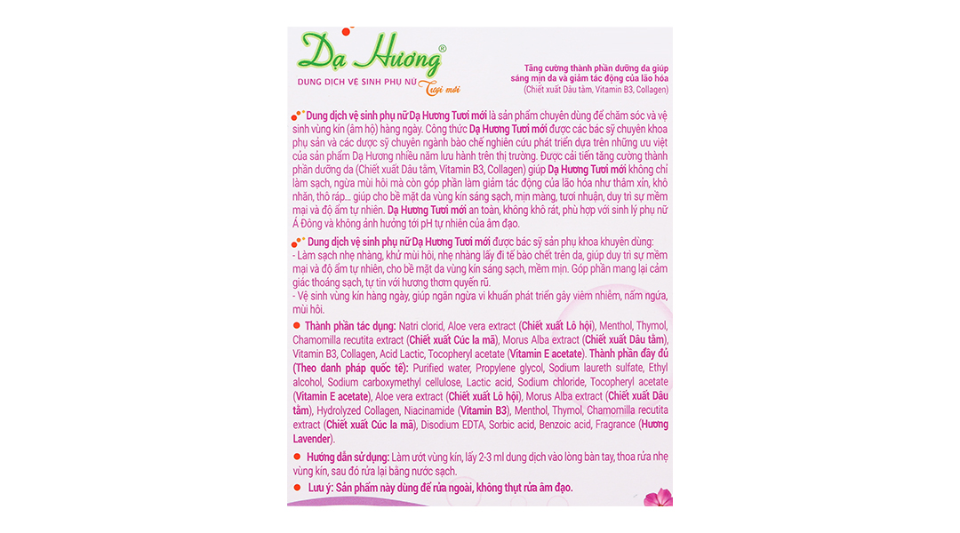 – Dung dịch vệ sinh phụ nữ Dạ Hương Tươi mới là sản phẩm chuyên dùng để chăm sóc và vệ sinh vùng kín (âm hộ) hàng ngày.