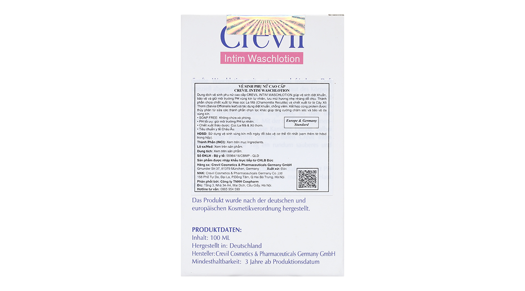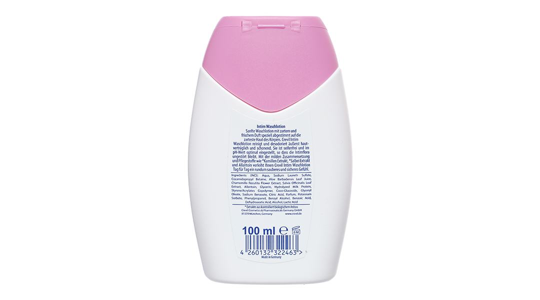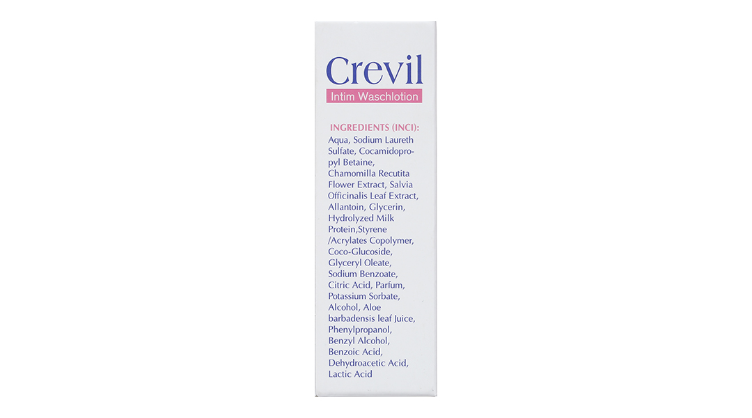 Thành phần chứa chiết xuất từ hoa cúc La Mã (Chamomilla Recutita), chiết xuất từ lá Cây Xô Thơm (Salvia Officinalis leaf), protein được thủy phân từ sữa cùng các thành phần khác, công thức và tiêu chuẩn y tế Châu Âu, dung dịch vệ sinh phụ nữ CREVIL INTIM WASCHLOTION giúp vệ sinh diệt khuẩn, kháng viêm, hỗ trợ điều trị các bệnh viêm nhiễm phụ khoa, bảo vệ môi trường pH tự nhiên, giữ da mềm mại và lưu mùi hương nhẹ nhàng dễ chịu.