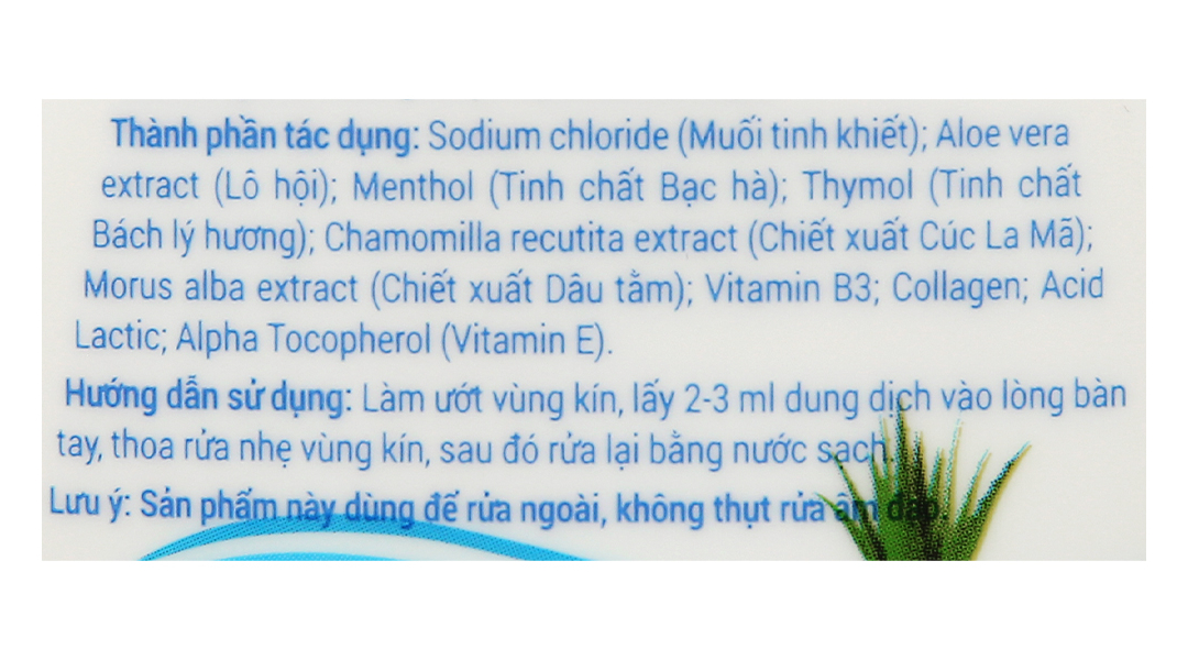 Thành phầnSodium chloride (Muối tinh khiết), Aloe vera extract (Lô hội), Menthol (Tinh chất Bạc hà), Thymol (Tinh chất Bách lý hương), Chamomilla recutita extract (Chiết xuất Cúc La Mã), Morus alba extract (Chiết xuất Dâu tằm), Vitamin B3,...