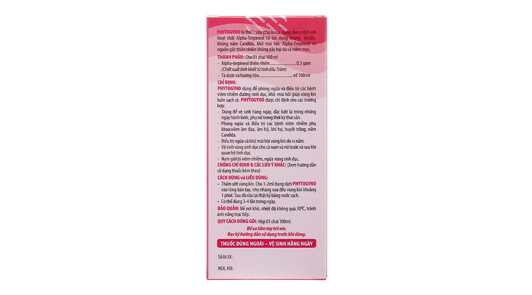 Thấm ướt vùng kín, cho khoảng 1 – 2ml dung dịch PHYTOGYNO vào lòng bàn tay, nhẹ nhàng xoa đều vùng kín khoảng 1 phút sau đó rửa lại bằng nước sạch.