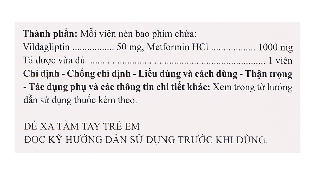 - Thử nghiệm lâm sàng kéo dài trên 2 năm không thấy có bất thường nào khác về an toàn và các nguy cơ không dự báo trước, khi vildagliptin được thêm vào phác đồ dùng metformin.