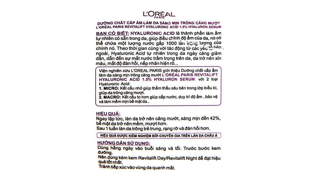 - Dưỡng chất LOreal cấp ẩm sáng mịn căng mướt 30ml còn được các tín đồ mỹ phẩm đặt tên là “serum siêu cấp ẩm Loreal” cung cấp ẩm cho làn da mịn màng, căng mướt và tràn đầy sức sống, cấp nước, duy trì và bảo vệ cho bề mặt của làn da được bảo vệ tối đa.