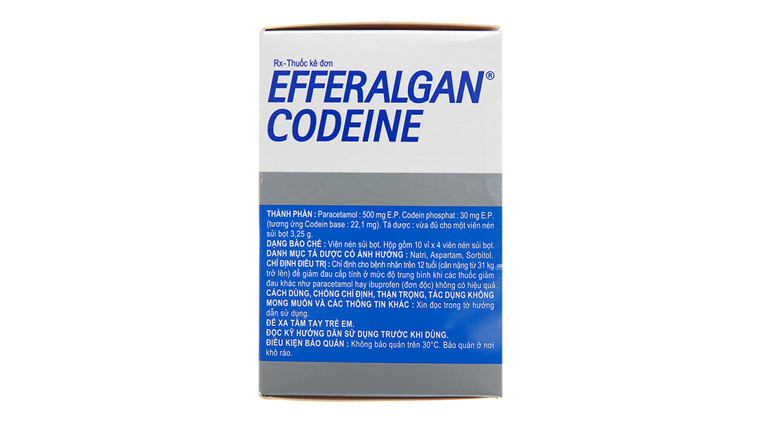 – Thận trọng khi sử dụngThuốc này chứa paracetamol. Hãy gặp bác sĩ ngay lập tức khi dùng quá liều hoặc ngẫu nhiên dùng liều quá cao. Thuốc này chứa paracetamol và codein. Nhiều thuốc khác cũng chứa những thành phần này. Bạn không được phối hợp các thuốc này với nhau để không được vượt quá liều tối đa khuyến cáo (Xem Liều dùng và cách dùng). Chỉ được phép dùng thuốc này cho trẻ em khi có chỉ định của bác sĩ. Không được điều trị lại cho trẻ em, mà trước đó không xin lại ý kiến bác sĩ. Phải dùng thuốc này kèm theo dõi trẻ em, nếu bạn cảm thấy trẻ em buồn ngủ quá mức, thì bạn không được cho trẻ liều khác. Dùng thuốc này lâu dài có thể gây phụ thuộc vào thuốc. Không được dùng thuốc trong thời gian dài mà không xin chỉ dẫn của bác sĩ. Không được dùng quá liều quy định và báo cáo ngay với bác sĩ khi có dùng quá liều. Không được dùng trong thời gian kéo dài mà không có ý kiến của chuyên môn, đặc biệt khi các rối loạn kéo dài quá 5 ngày và/trong hiện tượng bắt đầu có triệu chứng khác khi tiếp tục dùng thuốc. Thuốc này chứa sorbitol, nên không được dùng cho bệnh nhân không dung nạp fructose (là bệnh chuyển hóa có tính di truyền). Thận trọng khi sử dụng CÁNH BÁO VÀ THẬN TRỌNG ĐẶC BIỆT ĐỐI VỚI NHÓM THUỐC EFFERALGAN CODEINE chứa codein là thuốc giảm đau opioid. Liên quan với opioid (Xem thêm Cảnh báo và thận trọng đặc biệt về sản phẩm, Liên quan với codein) Tác dụng trên hệ thần kinh trung ương Tác dụng của opioid trên hệ thần kinh trung ương (CNS) có thể gây ra suy hô hấp nghiêm trọng, có khả năng gây tử vong. Tác dụng ức chế hệ thần kinh trung ương của opioid, bao gồm ức chế hô hấp và an thần, phải được xem xét trong trường hợp đã biết hoặc nghi ngờ bệnh lý nội sọ như chấn thương đầu hoặc tổn thương nội sọ khác. Các tác dụng này trên hệ thần kinh trung ương cũng có thể làm phức tạp cho việc đánh giá về thần kinh. Nên thận trọng khi sử dụng opioid ở bệnh nhân bị động kinh do khả năng làm giảm ngưỡng co giật. Sử dụng kéo dài thuốc giảm đau bao gồm cả opioid làm tăng nguy cơ nhức đầu do lạm dụng thuốc. Điều trị bằng opioid, đặc biệt khi sử dụng lâu dài, có thể gây tăng cảm giác đau ở một số người. Sử dụng đồng thời rượu và codein có thể làm tăng ức chế hệ thần kinh trung ương. Không khuyến cáo uống rượu trong khi điều trị bằng EFFERALGAN CODEINE (Xem thêm Cảnh báo và thận trọng đặc biệt về sản phẩm, Liên quan với paracetamol). Tác dụng trên hô hấp Chống chỉ định dùng EFFERALGAN CODEINE trong các tình trạng hô hấp đặc trưng bởi suy hô hấp ở bất kỳ mức độ nào. Opioid gây suy hô hấp thông qua tác dụng ức chế hệ thần kinh trung ương. Nguy cơ suy hô hấp có thể tăng lên do sử dụng thuốc đồng thời (Xem Tương tác với các thuốc khác và các dạng tương tác khác) và các yếu tố dược di truyền (Xem Cảnh báo và thận trọng đặc biệt về sản phẩm, Liên quan với codein, Người chuyển hóa cực nhanh codein và Phụ nữ có thai và cho con bú, Phụ nữ có thai, Liên quan với codein). Nên thận trọng khi sử dụng EFFERALGAN CODEINE ở bệnh nhân bị hen. Các opioid, đặc biệt là morphin và các dẫn xuất, có thể gây phóng thích histamin. Hoạt tính trị ho của opioid có thể bất lợi trong các tình trạng hô hấp mà ho có đờm là có lợi. Tác dụng trên tiêu hóa Táo bón, có thể kháng lại điều trị bằng thuốc nhuận trường, là một tác dụng phụ của việc điều trị bằng opioid và cần phải theo dõi chức năng ruột. Buồn nôn và nôn cũng là tác dụng phụ của việc điều trị bằng opioid, ở một số người, tỷ lệ buồn nôn và nôn có thể giảm với việc sử dụng hoặc phát sinh sự dung nạp thuốc (quen thuốc). Sử dụng opioid có thể che lấp các triệu chứng của tình trạng bụng cấp tính. Một số opioid, bao gồm cả morphin, được cho là làm tăng áp lực cơ vòng Oddi, cho thấy cần thận trọng khi sử dụng trong các trường hợp bệnh đường dẫn mật như viêm tụy và sỏi mật mặc dù tác dụng rõ ràng chưa được xác định. Tác dụng trên da Ngứa là một tác dụng phụ của việc điều trị bằng opioid. Tác dụng trên hormon Opioid có thể làm giảm nồng độ hormon và cần được sử dụng thận trọng ở bệnh nhân bị rối loạn hormon Tác dụng trên miễn dịch Một số opioid, bao gồm cả morphin, có thể có tác dụng ức chế chức năng miễn dịch. Ý nghĩa lâm sàng của tác dụng này chưa được xác định. Tác dụng trên hệ cơ xương Cứng cơ và giật rung cơ có thể xảy ra với liệu pháp opioid. Tác dụng trên hệ niệu – sinh dục Opioid có thể gây bí tiểu do làm giảm trương lực cơ trơn trong bàng quang, giảm nhận biết về sự căng đầy bàng quang và ức chế phản xạ tiểu tiện. Do đó, nên thận trọng khi sử dụng opioid ở những bệnh nhân bị hẹp niệu đạo hoặc phì đại tuyến tiền liệt. Tác dụng trên tim mạch và mạch máu não Những bệnh nhân bị giảm lưu lượng máu ho