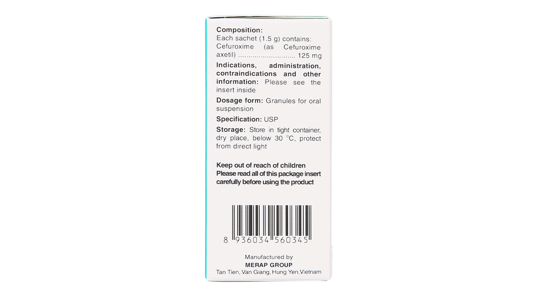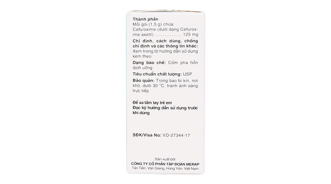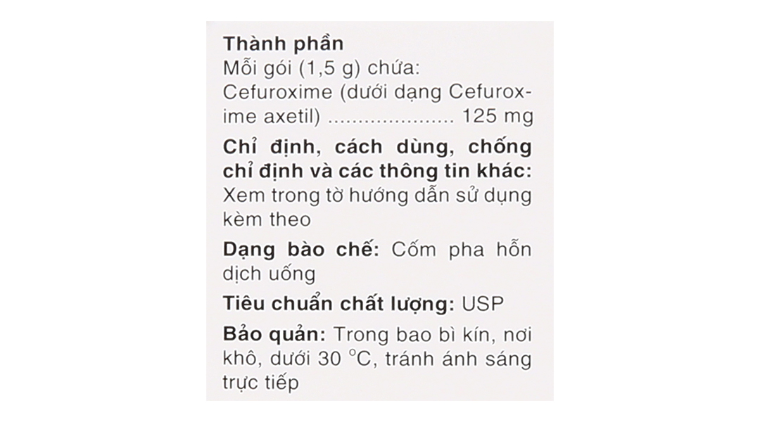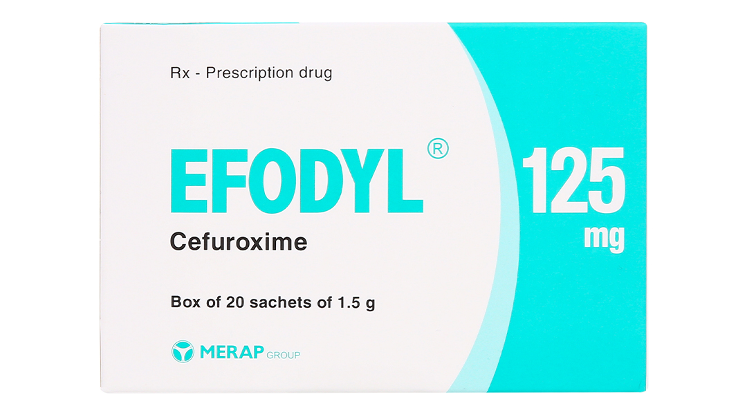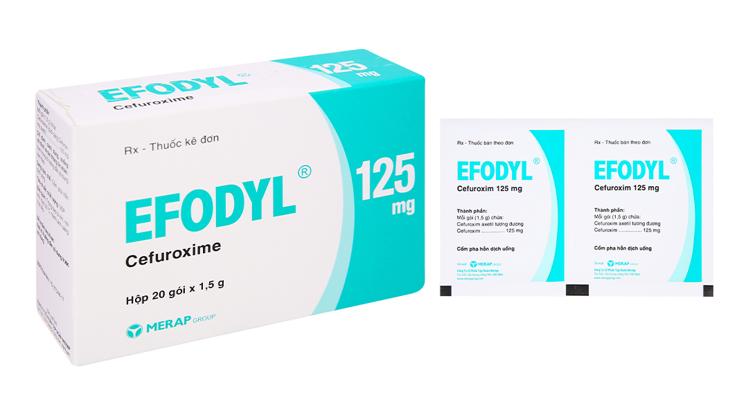- EFODYL® 125mg: Mỗi gói cốm đơn liều (1,5g) chứa 125mg cefuroxime dưới dạng cefuroxime axetil.