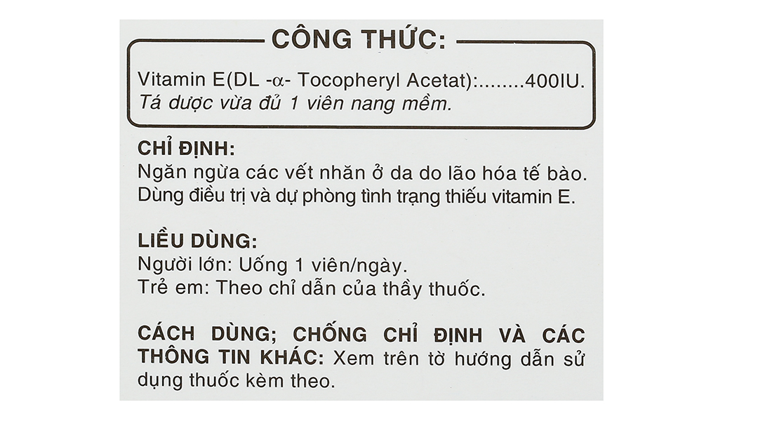 Công dụngNgăn ngừa các vết nhăn ở da do lão hóa, điều trị & dự phòng tình trạng thiếu Vitamin E