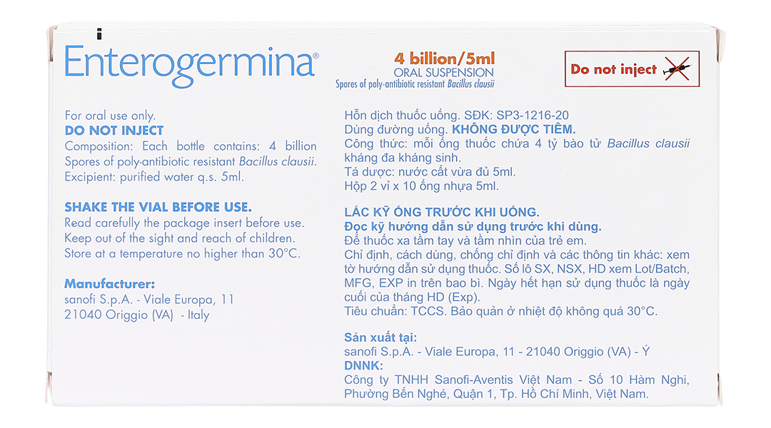 Có thể thấy các hạt nhỏ trong ống thuốc Enterogermina do sự tập hợp của các bào tử Bacillus Clausii, điều đó có nghĩa là thuốc không bị thay đổi chất lượng. Không có chống chỉ định sử dụng Enterogermina trên bệnh nhân bị tiêu chảy mỡ.