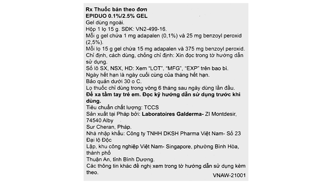 Tránh để gel Epiduo dây lên vật liệu có màu bao gồm tóc và vải nhuộm vì thuốc có thể làm bạc màu hoặc mất màu.