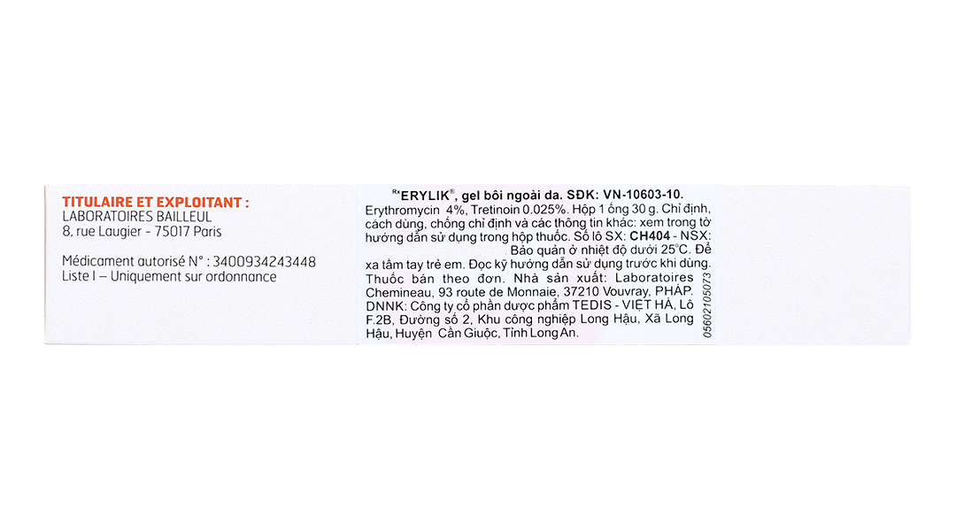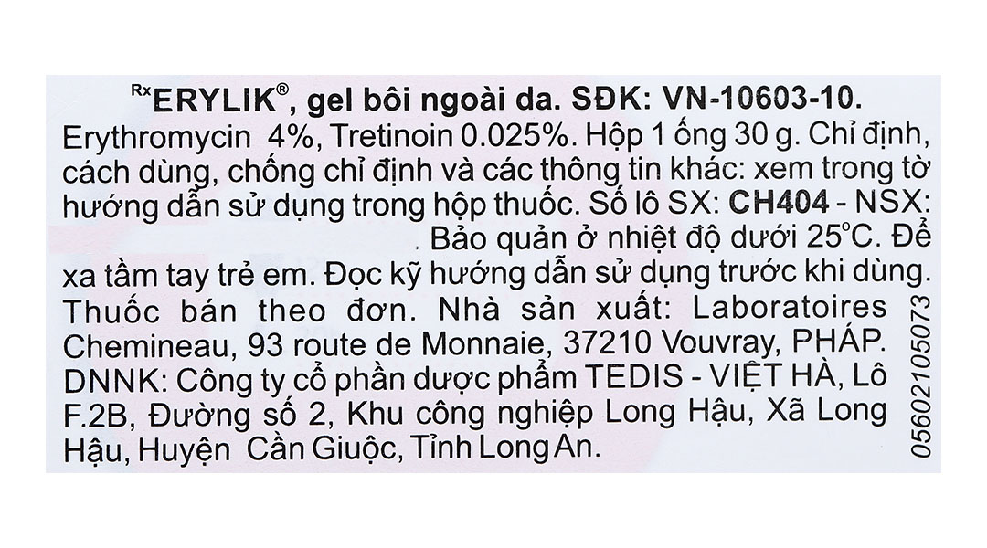 - Hoạt chất: Erythromycin 4,000g; Tretinoin 0,025g.