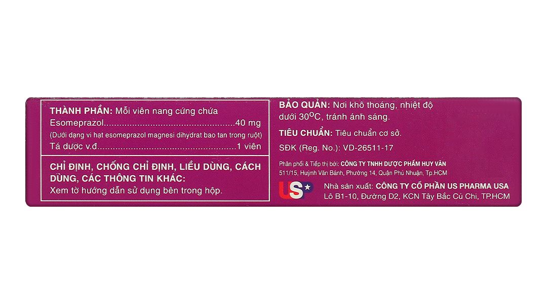 - Dược chất: Esomeprazol (dưới dạng vi hạt Esomeprazol magnesium dihydrat bao tan trong ruột) 40 mg.