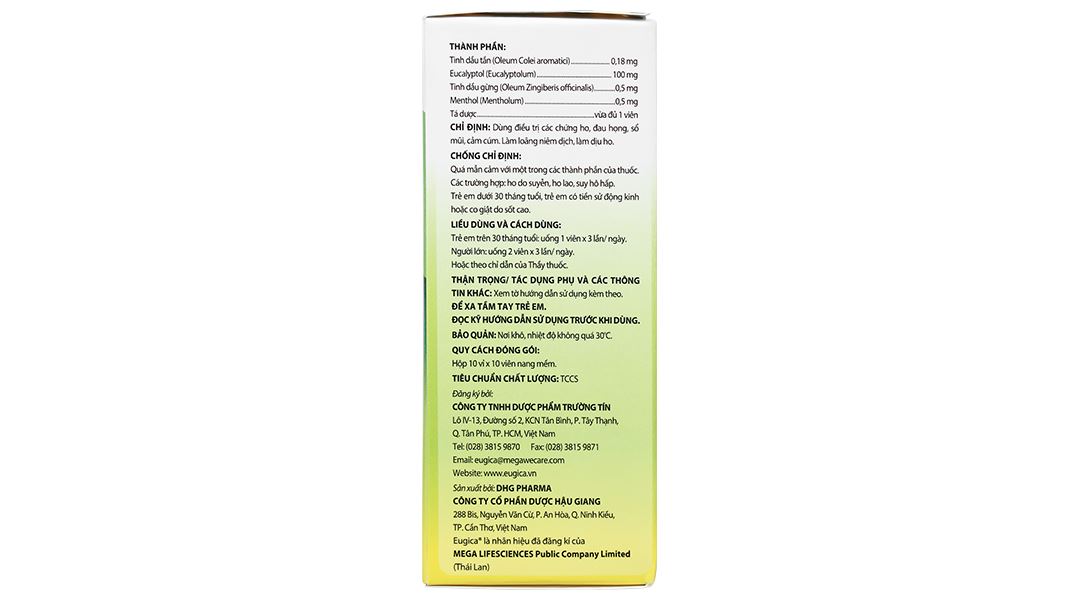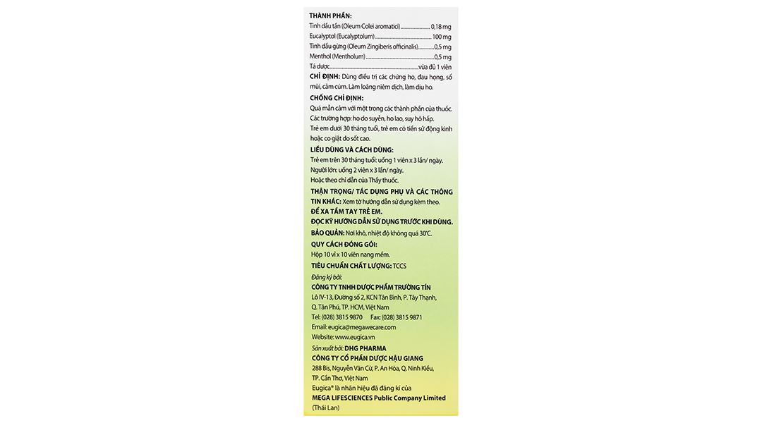 Eugica kết hợp trích tinh, tinh dầu của các dược liệu thuộc nhóm cây thuốc chữa ho, cảm cúm gồm: tần, bạc hà, gừng. Eugica được bào chế dạng viên nang mềm bằng công nghệ hiện đại, với các thành phần hoạt chất hoàn toàn từ cây thuốc, vị thuốc thiên nhiên không gây độc hại, phóng thích các hoạt chất bên trong ngay sau khi uống và nhanh chóng phát huy tác dụng.