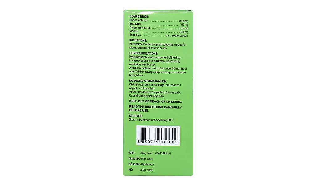 Mô tả: Viên nang mềm hình bầu dục, màu xanh lá, bên trong chứa dung dịch màu vàng hoặc vàng hơi xanh, trong, thơm mùi dược liệu.