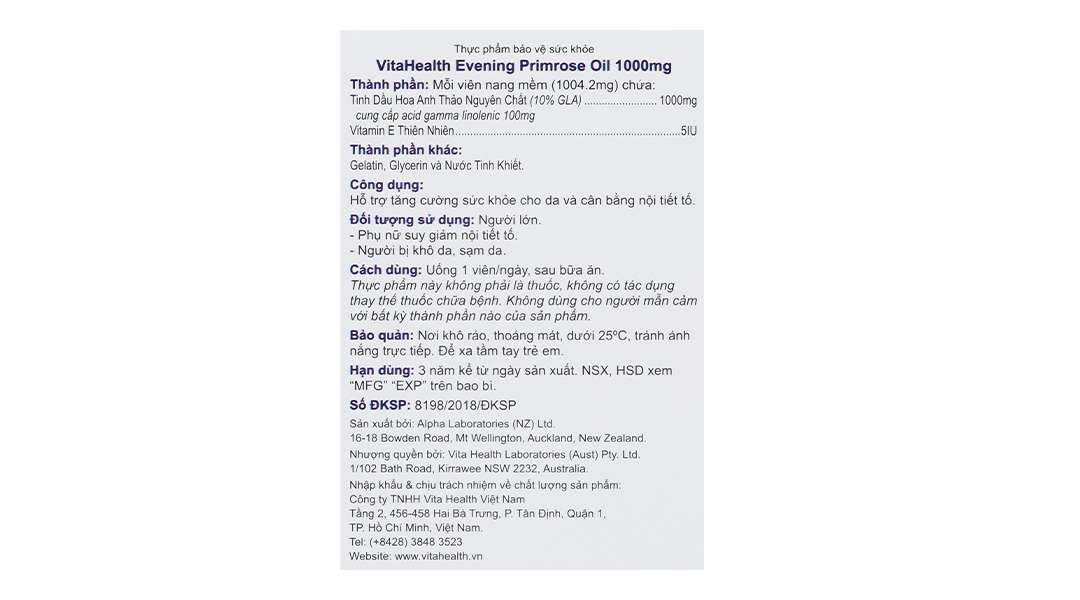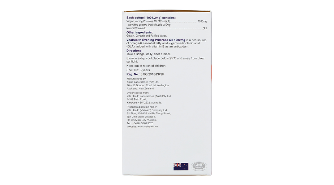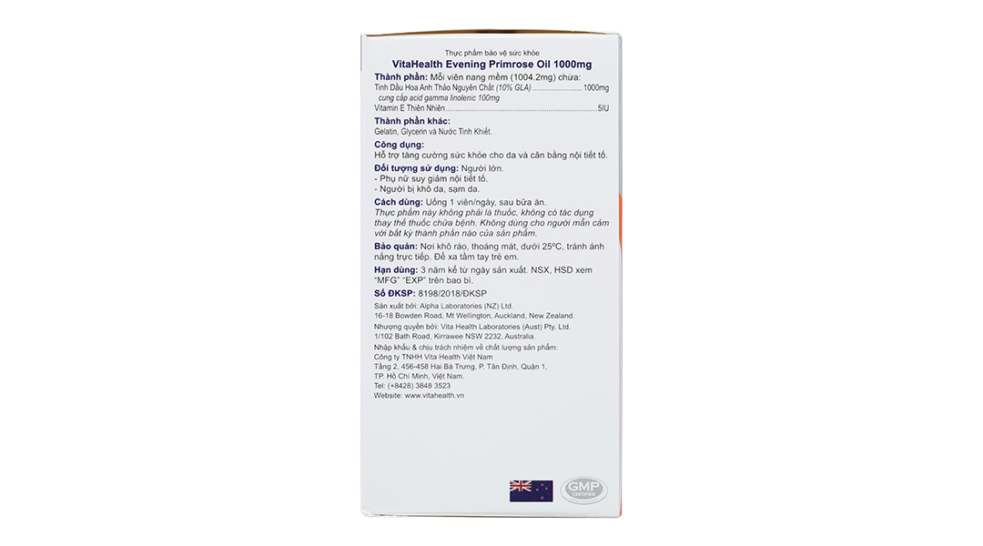 Evening Primrose Oil là sản phẩm của thương hiệu VitaHealth – công ty con của tập đoàn chăm sóc sức khoẻ đến từ Úc – Vita Life Sciences. Các tiêu chuẩn nghiêm ngặt của VitaHealth đảm bảo tạo ra các sản phẩm tinh khiết và hiệu quả đáp ứng các tiêu chuẩn quy định tại các thị trường khác nhau trong khu vực.