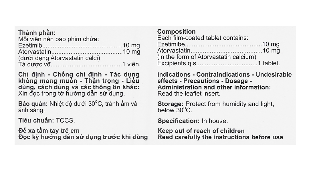 Thời kỳ cho con bú: Không biết liệu thuốc có bài tiết trong sữa mẹ hay không vì vậy chống chỉ định dùng thuốc này ở phụ nữ đang cho con bú. – Khả năng lái xe và vận hành máy mócChưa có bằng chứng về ảnh hưởng của thuốc lên khả năng lái xe, vận hành máy móc. Tuy nhiên cần lưu ý các tác dụng phụ như đau đầu, chóng mặt, nhìn mờ có thể xảy ra trong thời gian dùng thuốc. – Tương tác thuốcTương tác của thuốc với các thuốc khác và các loại tương tác khác: Nguy cơ của bệnh cơ khi điều trị dài hạn với thuốc này được tăng lên (do chứa ezetimib và (atorvastatin) khi uống đồng thời với các dẫn chất của acid fibric, niacin, cyclosporin, hoặc các chất ức chế CYP3A4 mạnh (ví dụ clarithromycin, thuốc ức chế protease HIV và itraconazol). Các chất ức chế cytochrom CYP3A4: Tránh điều trị phối hợp thuốc này với cyclosporin, erythromycin, gemfibrozil, itraconazol, ketoconazol (do ức chế cytochrom CYP3A4), với niacin ở liều hạ lipid (> 1g/ngày), với colchicin và với các thuốc hạ cholesterol máu nhóm fibrat khác vì có thể gây viêm cơ và tiêu cơ vân. Dẫn chất coumarin: Atorvastatin có thể làm tăng tác dụng của warfarin. Phải xác định thời gian prothrombin trước khi bắt đầu dùng thuốc này và theo dõi thường xuyên trong giai đoạn đầu điều trị để bảo đảm không có thay đổi nhiều về thời gian prothrombin. Nhựa gắn acid mật: Atorvastatin và nhựa gắn acid mật (cholestyramin, colestipol) có cơ chế tác dụng bổ sung cho nhau; phối hợp các nhóm thuốc này có tác dụng cộng lực trên cholesterol LDL. Tuy nhiên nhóm thuốc này có thể làm giảm rõ rệt khả dụng sinh học của atorvastatin khi uống cùng, vì vậy thời gian dùng 2 thuốc này phải cách xa nhau khoảng 2 giờ để tránh tương tác rõ rệt do thuốc gắn vào nhựa. Các thuốc hạ lipid khác: Hạn chế phối hợp thuốc này với các thuốc hạ lipid khác vì khả năng tăng nguy cơ bệnh cơ. Mặc dù không tiến hành các nghiên cứu về tương tác thuốc trong lâm sàng, nhưng không thấy có biểu hiện tương tác có hại có ý nghĩa lâm sàng khi dùng atorvastatin cùng với các chất ức chế men chuyển angiotensin, các thuốc chẹn beta, chẹn kênh calci, thuốc lợi tiểu và thuốc chống viêm không steroid. Rifampin Rifampin làm giảm nồng độ atorvastatin khi phối hợp với nhau. Nếu phối hợp 2 thuốc, các thuốc đó phải uống cùng một lúc, vì uống atorvastatin sau khi uống rifampin làm giảm nhiều nồng độ atorvastatin huyết tương. Diltiazem: Làm tăng nồng độ atorvastatin trong huyết tương, có nguy cơ tiêu sợi cơ, suy thận. Thuốc ngừa thai đường uống: Dùng đồng thời với thuốc ngừa thai đường uống có chứa norethindron và ethinyl estradiol làm tăng giá trị diện tích dưới đường cong nồng độ – thời gian (AUC) của norethindron và ethinyl estradiol khoảng 30% và 20%. Nên cân nhắc về sự tăng này khi chọn lựa thuốc ngừa thai đường uống cho phụ nữ sử dụng atorvastatin. Các thuốc kháng acid: Sử dụng atorvastatin đồng thời với các hỗn dịch kháng acid có chứa magnesi và nhôm hydroxyd, nồng độ huyết tương của atorvastatin bị giảm khoảng 35%. Khi dùng cùng thuốc kháng acid tỉ lệ hấp thu của ezetimib giảm nhưng không ảnh hưởng đến sinh khả dụng của ezetimib. Việc giảm tỉ lệ hấp thu này được xem không có ý nghĩa trên lâm sàng. Thuốc ức chế protease của HIV và viêm gan siêu vi C (HCV): Việc sử dụng đồng thời atorvastatin với các thuốc ức chế protease của HIV và viêm gan siêu vi C (HCV) có thể làm tăng nguy cơ gây tổn thương cơ nghiêm trọng nhất là tiêu cơ vân, thận hư dẫn đến suy thận và có thể gây tử vong, vì vậy cần giảm liều atorvastatin theo khuyến cáo ở bảng sau: