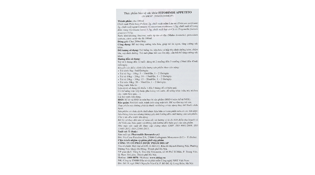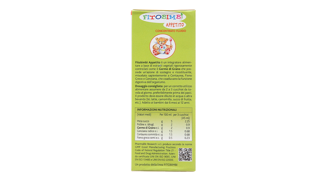 - Fitobimbi Appetito được sản xuất bởi Pharmalife Research – công ty Dược phẩm hàng đầu tại Ý và châu Âu, tạo ra các sản phẩm thảo dược an toàn hiệu quả, chăm sóc và bảo vệ sức khỏe cho trẻ.