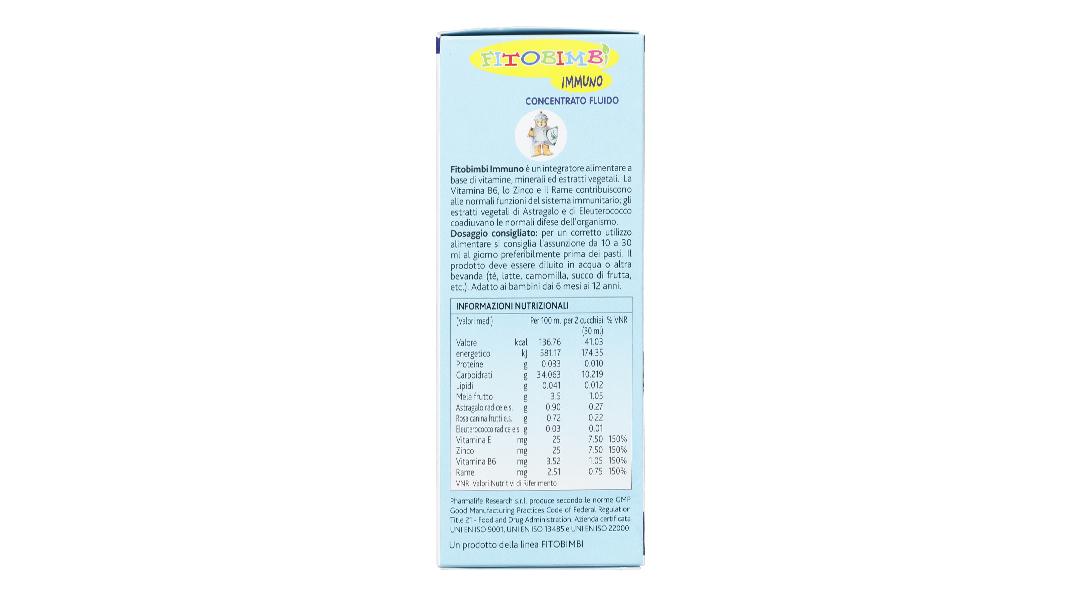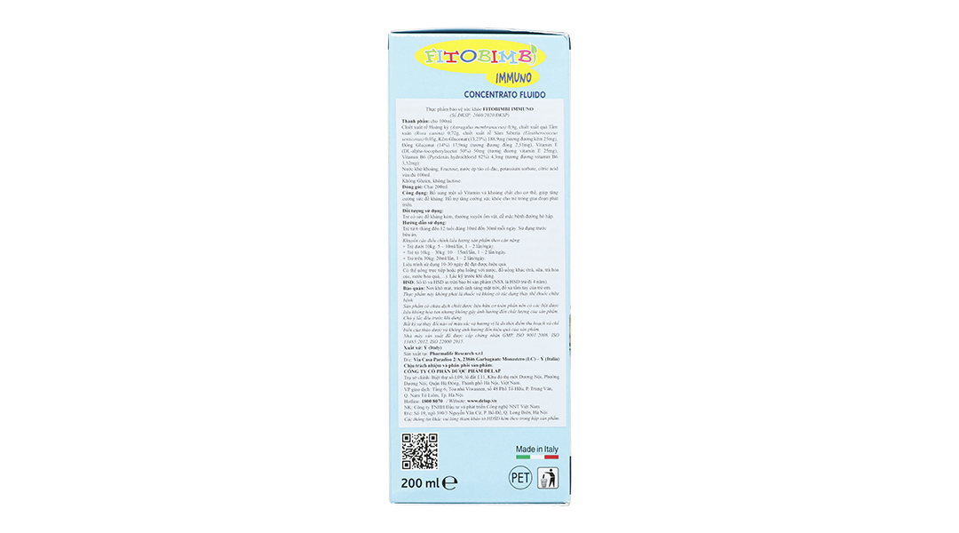 - Fitobimbi Immuno là sản phẩm bổ sung vitamin và khoáng chất thiết yếu, nhập khẩu nguyên chai từ Ý, giúp tăng cường sức đề kháng cho trẻ em. Với công thức chứa các chiết xuất thảo dược như rễ Hoàng Kỳ, quả Tầm Xuân, rễ Sâm Siberia cùng các khoáng chất và vitamin quan trọng như Kẽm, Đồng, Vitamin E, và Vitamin B6, Fitobimbi Immuno hỗ trợ bảo vệ cơ thể trẻ khỏi các tác nhân gây bệnh, đặc biệt là các bệnh về đường hô hấp.