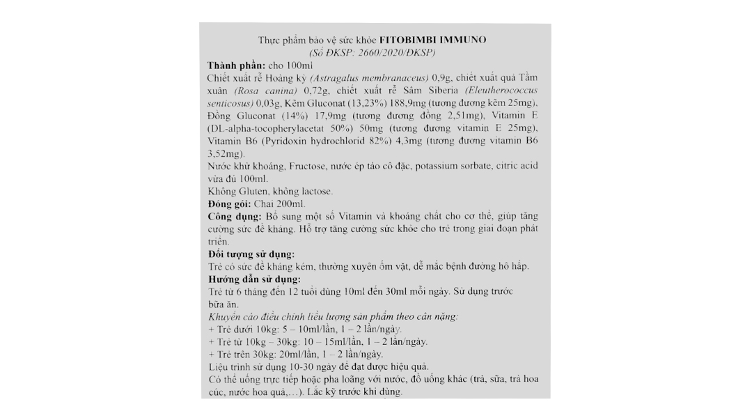 - Sản phẩm có vị ngọt thanh, dễ uống và không chứa lactose, gluten, phù hợp với những trẻ em có nhu cầu tăng cường sức khỏe. Fitobimbi Immuno giúp cải thiện hệ miễn dịch, giúp trẻ phát triển khỏe mạnh, giảm thiểu nguy cơ mắc các bệnh vặt và tăng cường sức đề kháng trong giai đoạn phát triển.