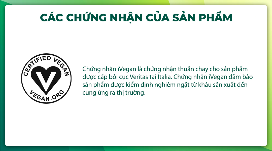 - Đặc biệt, sản phẩm này đã được chứng nhận iVegan, đảm bảo không sử dụng các thành phần có nguồn gốc động vật, sản phẩm còn sản xuất trên dây chuyền hiện đại và kiểm soát nghiêm ngặt từ Italia (theo GMP, ISO 22000) nên rất phù hợp với chế độ ăn thuần chay và an toàn cho mọi trẻ em.