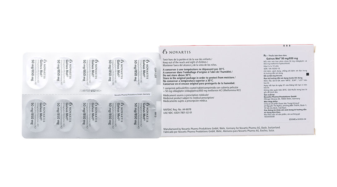 – Thận trọng khi sử dụngĐọc kỹ hướng dẫn sử dụng trước khi dùng. Nếu cần thêm thông tin, xin hỏi ý kiến bác sĩ. Thuốc này chỉ dùng theo sự kê đơn của thầy thuốc Galvus Met Galvus Met không phải là một chất thay thế insulin để dùng cho bệnh nhân cần insulin. Galvus Met không được dùng cho bệnh nhân đái tháo đường tuýp 1 hoặc để điều trị nhiễm ceton acid do đái tháo đường. Vildagliptin Suy gan Vildagliptin không khuyến cáo dùng cho bệnh nhân bị suy gan, kể cả bệnh nhân có ALT hoặc AST trước điều trị > 2,5 lần giới hạn trên của bình thường. Theo dõi men (enzym) gan Rất hiếm trường hợp rối loạn chức năng gan (kể cả viêm gan) được báo cáo là do vildagliptin. Nếu xảy ra, bệnh nhân thường không có triệu chứng và không để lại di chứng lâm sàng. Các xét nghiệm chức năng gan sẽ trở về bình thường sau khi ngừng thuốc. Các xét nghiệm chức năng gan cần được tiến hành trước khi tiến hành điều trị bằng Galvus Met. Các xét nghiệm chức năng gan cần được theo dõi trong khi điều trị bằng Galvus Met cứ 3 tháng một lần trong năm đầu và định kỳ sau đó. Những bệnh nhân bị tăng hàm lượng transaminase cần được đánh giá lại chức năng gan lần thứ hai để khẳng định kết quả, và sau đó, phải thường xuyên xét nghiệm chức năng gan cho đến khi chức năng gan trở về bình thường. Nếu AST hoặc ALT tăng gấp 3 lần giới hạn trên của bình thường hoặc lớn hơn và kéo dài, cần ngừng dùng Galvus Met. Nếu bệnh nhân bị vàng da hoặc có các biểu hiện khác nghi là do rối loạn chức năng gan, cần ngừng dùng Galvus Met và đến thầy thuốc khám ngay. Sau khi ngừng điều trị bằng Galvus Met và các xét nghiệm chức năng gan đã về bình thường cũng không được dùng lại Galvus Met. Galvus Met không được khuyến cáo dùng cho bệnh nhân bị suy gan. Suy tim Một thử nghiệm lâm sàng với vildagliptin trên bệnh nhân có phân độ suy tim theo Hiệp hội tim New York (NYHA) từ I-III cho thấy điều trị với vildagliptin không liên quan đến sự thay đổi chức năng thất trái hoặc làm nặng thêm tình trạng suy tim sung huyết (CHF) trước đó, so với giả dược. Kinh nghiệm lâm sàng trên những bệnh nhân có suy tim độ III theo NYHA được điều trị với vildagliptin còn hạn chế và kết quả là không kết luận được (xem phần CÁC NGHIÊN CỨU LÂM SÀNG). Không có kinh nghiệm sử dụng vildagliptin cho các bệnh nhân bị suy tim độ IV theo NYHA trong các nghiên cứu lâm sàng và vì vậy, vildagliptin không được khuyến cáo sử dụng cho nhóm bệnh nhân này. Viêm tụy cấp Việc sử dụng vildagliptin có liên quan tới nguy cơ tiến triển viêm tụy cấp. Bệnh nhân cần được thông tin về các triệu chứng điển hình của viêm tụy cấp như đau bụng nhiều và kéo dài. Nếu nghi ngờ viêm tụy, nên ngừng điều trị bằng vildagliptin; nếu đã xác định viêm tụy cấp, không nên điều trị lại bằng vildagliptin. Nên thận trọng với bệnh nhân có tiền sử viêm tụy cấp. Metformin hydrochlorid Nhiễm acid lactic Nhiễm acid lactic là phản ứng bất lợi chuyển hoá rất hiếm xảy ra, nhưng rất nặng, có thể là do tích luỹ metformin. Các trường hợp báo cáo về nhiễm acid lactic ở bệnh nhân dùng metformin xảy ra chủ yếu ở bệnh nhân đái tháo đường kèm suy thận đáng kể. Tỷ lệ nhiễm acid lactic có thể và nên được giảm thiểu bằng cách đánh giá các yếu tố nguy cơ kèm theo khác như tình trạng kiểm soát đái tháo đường kém, nhiễm ceton, đói kéo dài, uống rượu quá nhiều, suy gan và các trường hợp bệnh lý giảm oxy mô (xem các mục CHỐNG CHỈ ĐỊNH và TƯƠNG TÁC THUỐC). Chẩn đoán nhiễm acid lactic Nhiễm acid lactic được đặc trưng bằng khó thở do nhiễm acid, đau bụng và hạ thân nhiệt, sau đó là hôn mê. Các kết quả xét nghiệm để chẩn đoán là giảm pH máu, hàm lượng lactat trong huyết tương trên 5 mmol/lít, tăng khoảng trống anion và tỷ số lactat/pyruvat. Nếu nghi ngờ bị nhiễm toan chuyển hoá, phải ngừng thuốc và chuyển ngay bệnh nhân đến bệnh viện (xem mục QUÁ LIỀU). Theo dõi chức năng thận Metformin hydrochlorid thải trừ chủ yếu qua thận, nên nguy cơ tích luỹ metformin hydrochlorid và nhiễm acid lactic tăng cùng với mức tổn thương chức năng thận. Do tuổi càng cao, chức năng thận càng giảm, nên Galvus Met cần được điều chỉnh liều thận trọng ở người cao tuổi để xác định được liều tối thiểu cho hiệu lực đạt mức đường huyết thích hợp, và chức năng thận cần được theo dõi thường xuyên. Cũng như vậy, cần đặc biệt chú ý các trường hợp chức năng thận có thể trở nên suy yếu như khi bắt đầu dùng các thuốc chống tăng huyết áp, các thuốc lợi niệu hoặc khi bắt đầu dùng một thuốc kháng viêm không steroid. Chức năng thận cần được kiểm tra trước khi bắt đầu dùng Galvus Met; sau đó, ít nhất một lần một năm ở bệnh nhân có chức năng thận bình thường và ít nhất 2 đến 4 lần một năm ở bệnh nhân có độ thanh thải creatinin ở giới hạn dưới của độ thanh thải bình thường v
