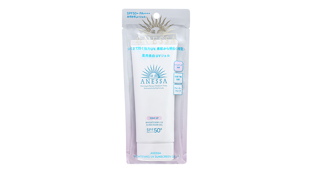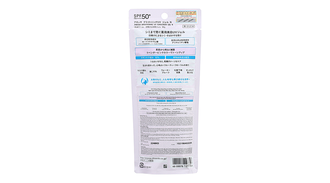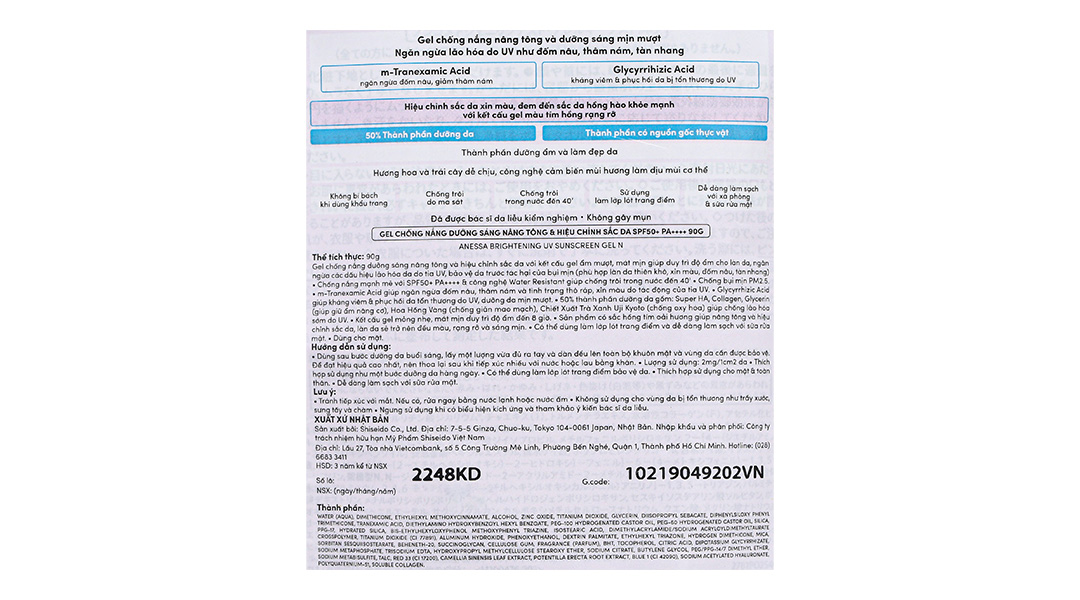 - Gel chống nắng ANESSA với thành phần dưỡng sáng da: m-Tranexamic acid giúp ức chế sản sinh hắc sắc tố melanin và cải thiện sự xuất hiện của đốm nâu. Đồng thời gel sắc tím oải hương có trong sản phẩm làm nâng tông và làm đều màu da tức thì.