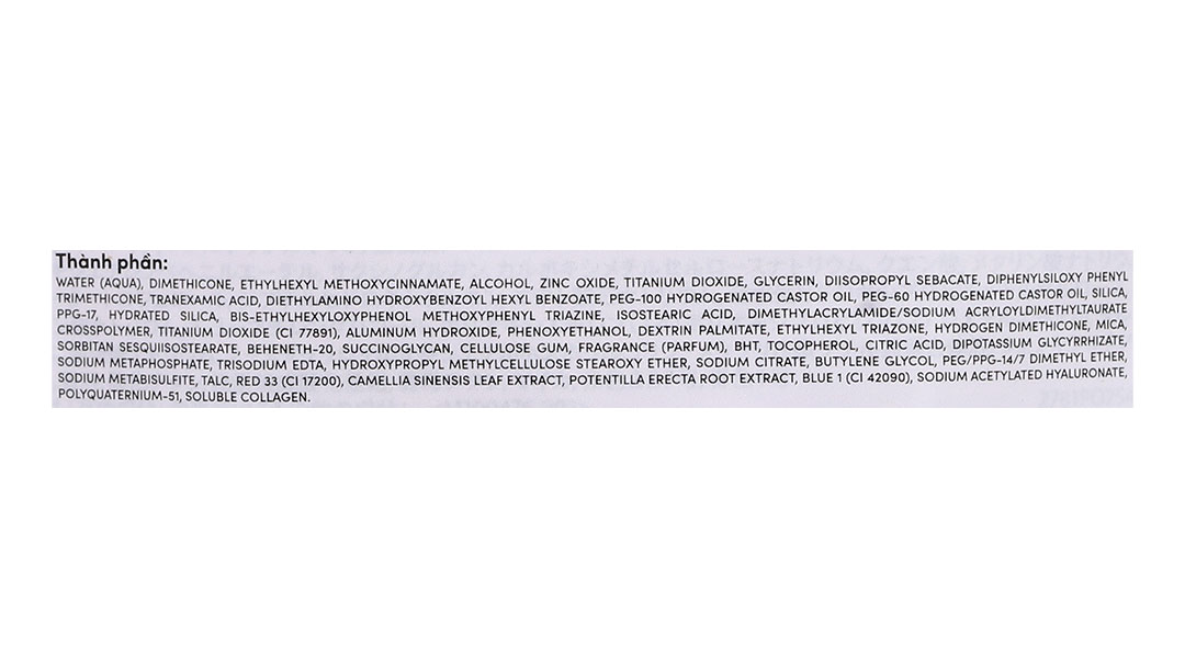 Water (aqua), dimethicone, ethylhexyl methoxycinnamate, alcohol, zinc oxide, titanium dioxide, glycerin, diisopropyl sebacate, diphenylsiloxy phenyl trimethicone, tranexamic acid, diethylamino hydroxybenzoyl hexyl benzoate, peg-100 hydrogenated castor oil, peg-60 hydrogenated castor oil, silica, ppg-17, hydrated silica, bis-ethylhexyloxyphenol methoxyphenyl triazine, isostearic acid, dimethylacrylamide/sodium acryloyldimethyltaurate crosspolymer, titanium dioxide (ci 77891), aluminum hydroxide, phenoxyethanol, dextrin palmitate, ethylhexyl triazone, hydrogen dimethicone, mica, sorbitan sesquiisostearate, beheneth-20, succinoglycan, cellulose gum, fragrance (parfum), bht, tocopherol, citric acid, dipotassium glycyrrhizate, sodium metaphosphate, trisodium edta, hydroxypropyl methylcellulose stearoxy ether, sodium citrate, butylene glycol, peg/ppg-14/7 dimethyl ether, sodium metabisulfite, talc, red 33 (ci 17200), camellia sinensis leaf extract, potentilla erecta root extract, blue 1 (ci 42090), sodium acetylated hyaluronate, polyquaternium-51, soluble collagen.
