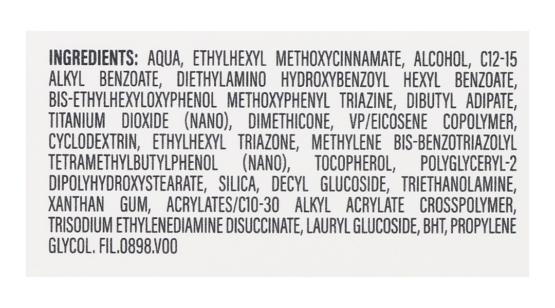 Aqua, Ethylhexyl Methoxycinnamate, Alcohol, C12-15 Alkyl Benzoate, Diethylamino Hydroxybenzoyl Hexyl Benzoate, Bis-Ethylhexyloxyphenol Methoxyphenyl Triazine, Dibutyl Adipate, Titanium Dioxide (Nano), Dimethicone, Vp/Eicosene Copolymer, Cyclodextrin, Ethylhexyl Triazone, Methylene Bis-Benzotriazolyl Tetramethylbutylphenol (Nano), Tocopherol, Polyglyceryl-2 Dipolyhydroxystearate, Silica, Decyl Glucoside, Triethanolamine, Xanthan Gum, Acrylates/C10-30 Alkyl Acrylate Crosspolymer, Trisodium Ethylenediamine Disuccinate, Lauryl Glucoside, BHT, Propylene Glycol. Fil.0898.V00.