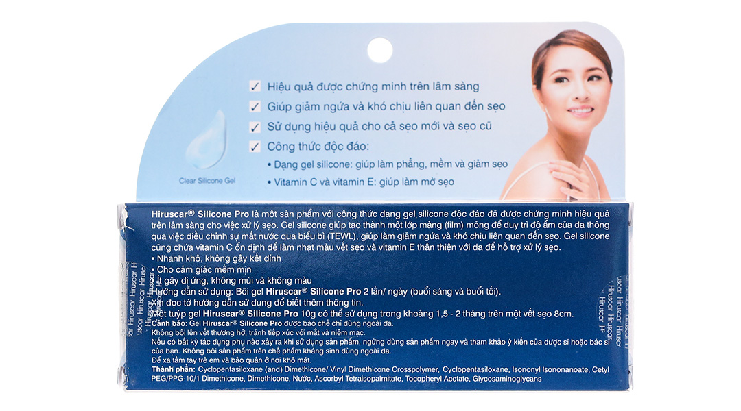 Hiruscar Silicone Pro 10g là một mỹ phẩm trị sẹo với công thức dạng gel silicone độc đáo đã được chứng minh hiệu quả trên lâm sàng cho việc xử lý sẹo. Gel silicone giúp tạo thành một lớp màng film mỏng để duy trì độ ẩm của da, thông qua việc điều chỉnh sự mất nước qua biểu bì, giúp làm giảm ngứa và khó chịu liên quan đến sẹo. Gel silicone cũng chứa vitamin C ổn định để làm nhạt màu vết sẹo và vitamin E thân thiện với da để hỗ trợ xử lý sẹo.