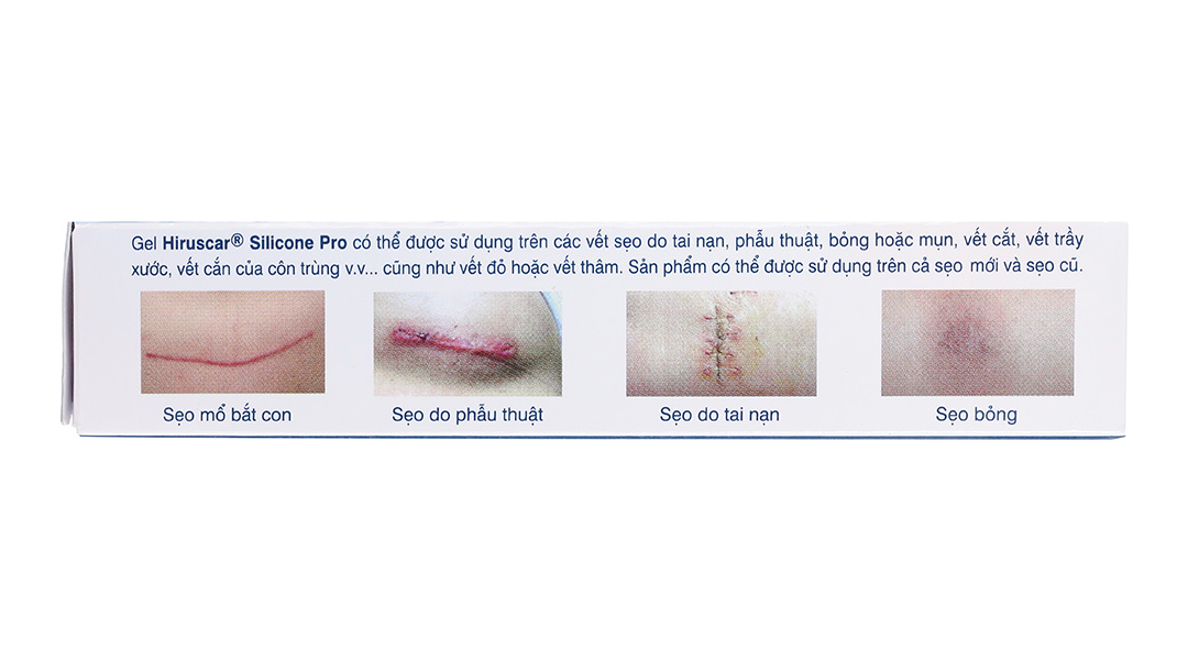 Gel Hiruscar Silicone Pro có thể được sử dụng trên các vết sẹo do tai nạn, phẫu thuật, bỏng hoặc mụn, vết cắt, vết trầy xước, vết cắn của côn trùng, cũng như vết đỏ hoặc vết thâm. Sản phẩm có thể được sử dụng trên cả sẹo mới và sẹo cũ.