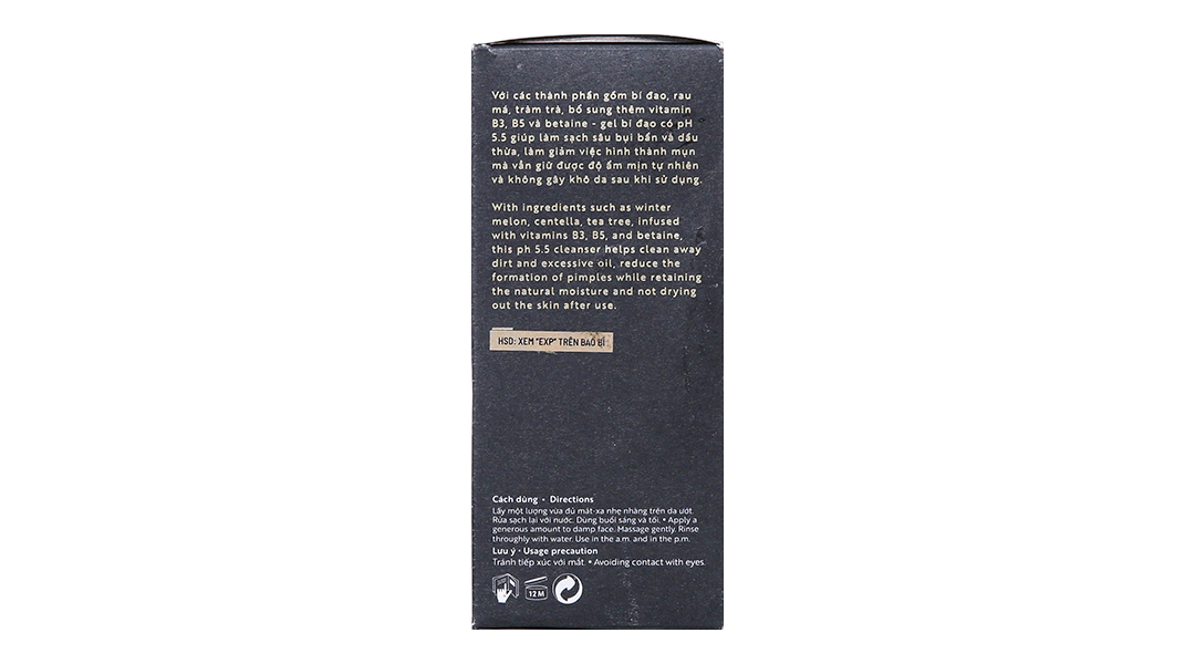 Với các thành phần gồm bí đao, rau má, tràm trà, bổ sung thêm vitamin B3, B5 và betaine-gel bí đao có pH 5.5 giúp làm sạch sâu bụi bẩn và dầu thừa, làm giảm việc hình thành mụn mà vẫn giữ được độ ẩm mịn tự nhiên và không gây khô da sau khi sử dụng.