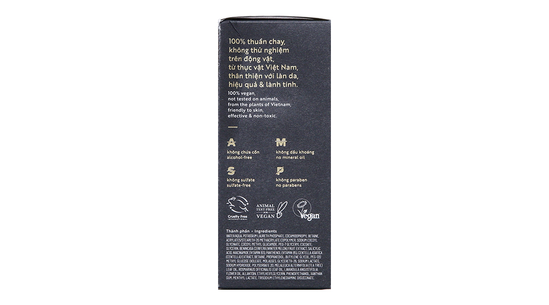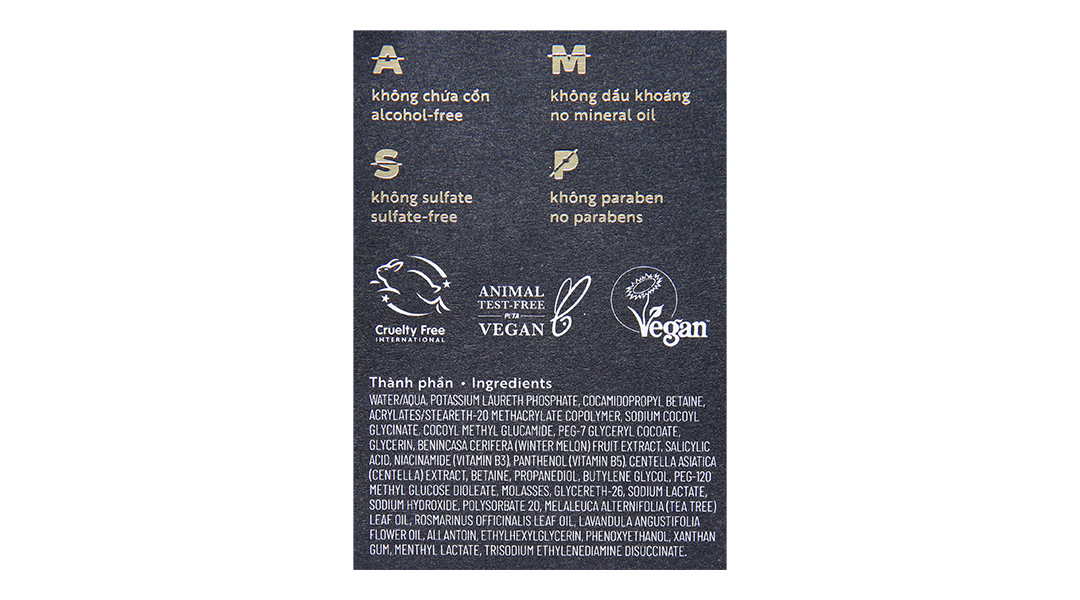 Water/Aqua, Potassium Laureth Phosphate, Cocamidopropyl Betaine, Acrylates/Steareth-20 Methacrylate Copolymer, Sodium Cocoyl Glycinate, Cocoyl Methyl Glucamide, PEG-7-Glyceryl Cocoate, Glycerin, Benincasa Cerifera (Bí đao) Fruit Extract, Salicylic Acid, Niacinamide (Vitamin B3), Panthenol (Vitamin B5), Centella Asiatica Extract (Rau má), Betaine, Propanediol, Butylene Glycol, PEG-120 Methyl Glucose Dioleate, Molasses, Glycereth-26, Sodium Lactate, Sodium Hydroxide, Polysorbate 20, Melaleuca Alternifolia (Tràm trà) Leaf Oil, Rosmarinus Officinalis (Hương thảo) Leaf Oil, Lavandula Angustifolia (Oải hương) Flower Oil, Allantoin, Ethylhexylglycerin, Phenoxyethanol, Xanthan gum, Menthyl Lactate, Sodium Phytate, Alcohol (0.01% – là dung môi trong hoạt chất càng hóa nước cứng, bắt các icon kim loại, bảo vệ sản phẩm khỏi tác nhân oxi hóa).