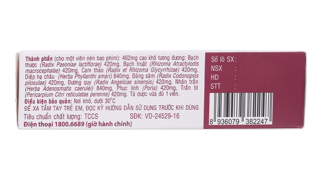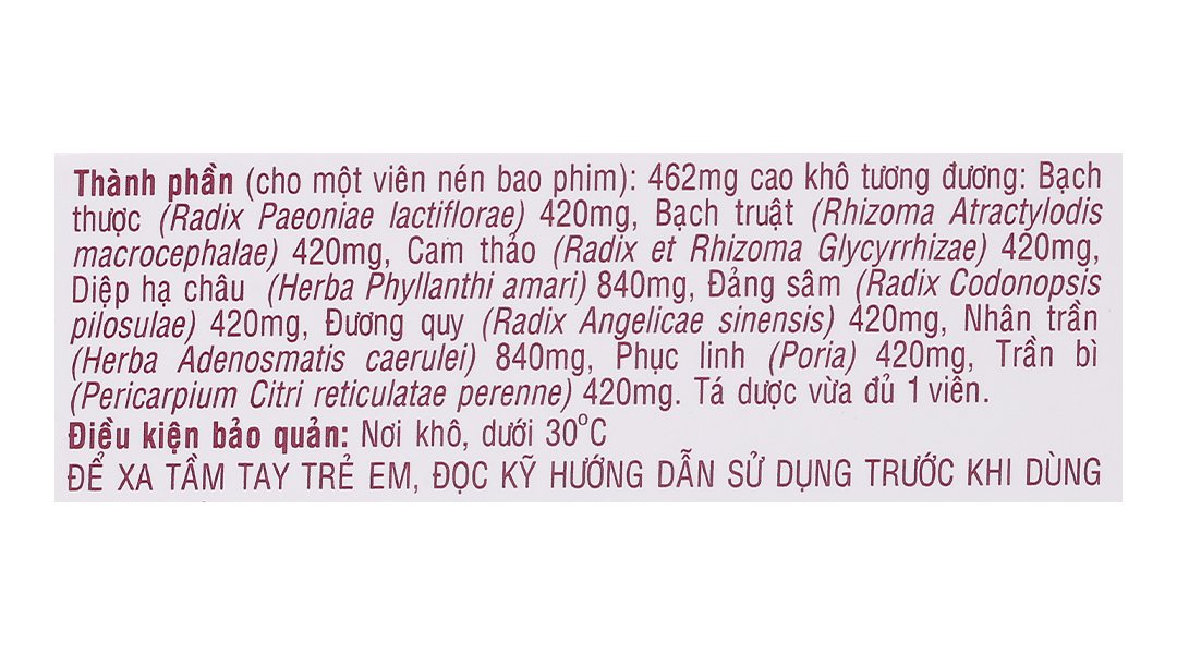 Hoạt chấtPhục linh, Nhân trần, Trần bì, Bạch truật, Bạch thược, Diệp hạ châu, Cam thảo, Đảng sâm, Đương quy