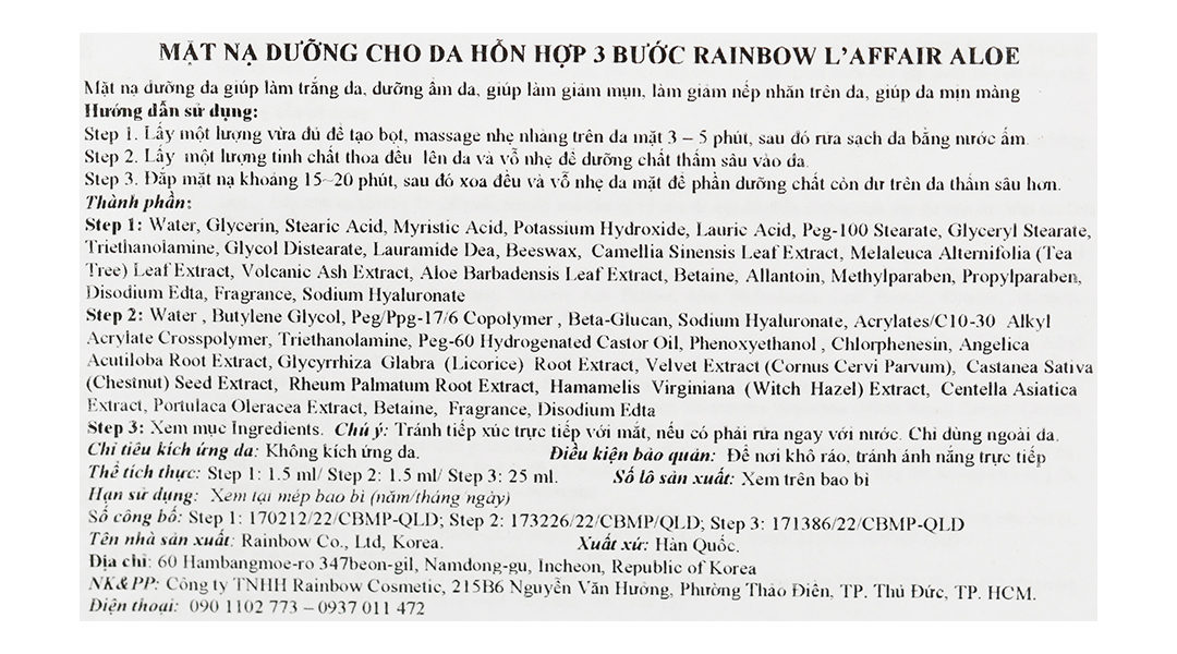 Mặt nạ Rainbow L’affair Aloe Soothing 3 bước cho da hỗn hợp miếng 28ml
