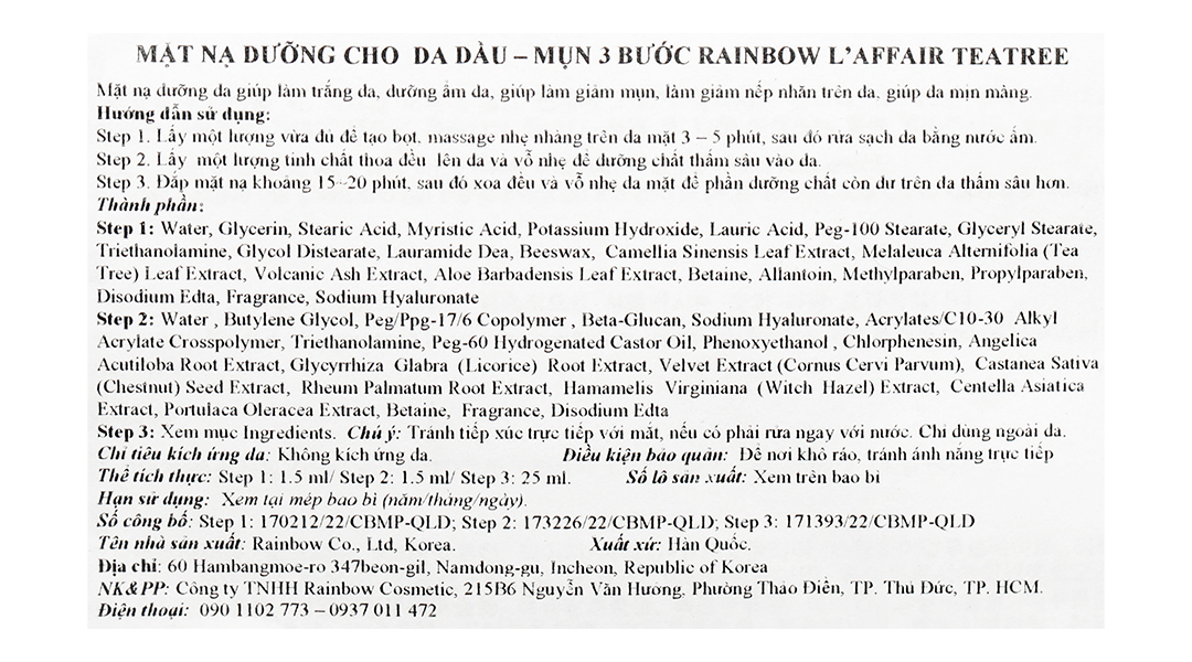 Step 3: Nước, Butylene Glycol, Glycerin, Beta-Glucan, PEG / PPG-17/6 Copolymer, Sodium Hyaluronate, Melaleuca alternifolia (Tea Tree) Extract (50mg), Adenosine (0,04%), PEG-60 Hydrogenated Castor Oil, carbomer, Triethanolamine , hydroxyetylxenlulo, Citrullus Colocynthis Fruit Extract, nhung Extract, Castanea Sativa (xưa) Seed Extract, Angelica Acutiloba Extract, Rheum palmatum Extract, Glycyrrhiza Glabra (Cam thảo) Extract, Betaine, Sophora Angustifolia Extract, Artemisia Vulgaris Extract, Diếp cá Extract, Hamamelis Virginia (Witch Hazel) Extract, Oryza Sativa (Gạo) Extract, Portulaca oleracea Extract, Gtycine Soja (đậu tương) Seed Extract, Chlorphenesin, Phenoxyethanol, Fragrance, Disodium EDTA