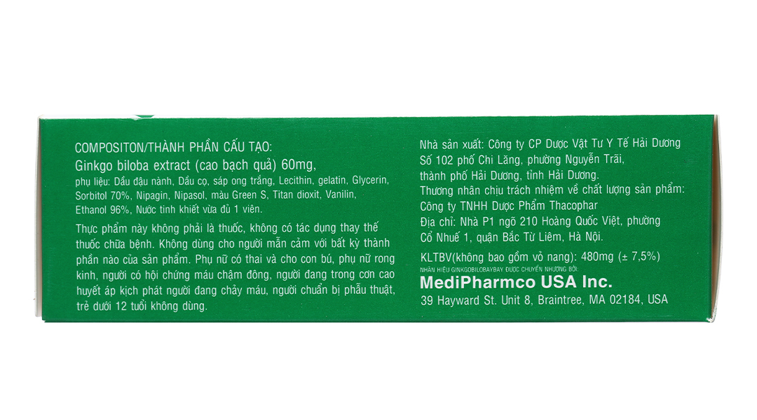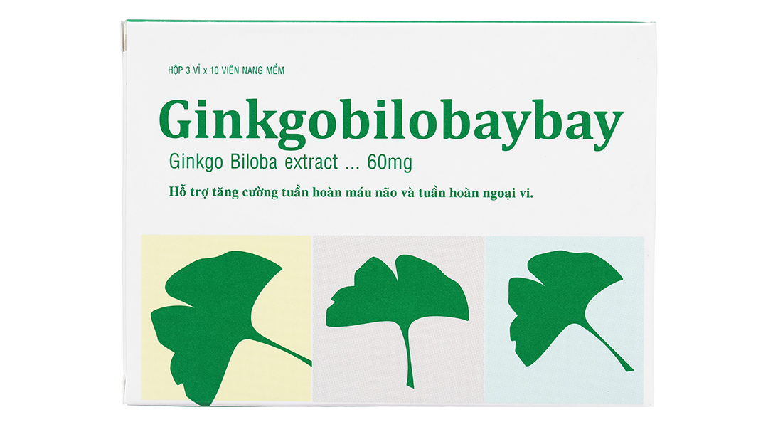 Ginkgobilobaybay là một sản phẩm của Công ty cổ phần Dược – Vật tư y tế Hải Dương với các thành phần là Gingko biloba, Soy bean oil và gelatin. Hỗ trợ tăng cường tuần hoàn máu não, hỗ trợ làm giảm các triệu chứng của thiểu năng tuần hoàn máu não như đau đầu, chóng mặt, trí nhớ giảm.