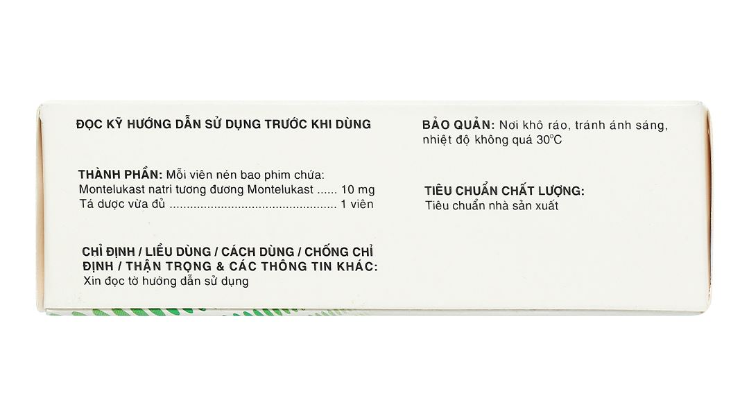 – Khả năng lái xe và vận hành máy mócMontelukast không ảnh hưởng hoặc ảnh hưởng không đáng kể đến khả năng lái xe và vận hành máy móc, tuy nhiên trong một số rất ít trường hợp, thuốc có thể gây chóng mặt, buồn ngủ. – Tương tác thuốc