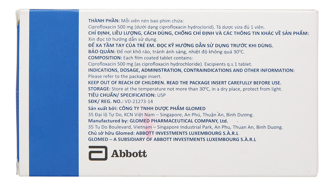 - Hoạt chất: Ciprofloxacin hydroclorid tương đương ciprofloxacin 500mg.