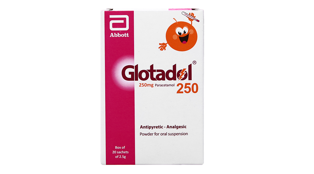 GLOTADOL 250 chứa paracetamol, 4′-hydroxyacetanilid, có dạng bột kết tinh màu trắng, không mùi, vị hơi đắng, là một thuốc hạ sốt, giảm đau non-opiat, non-salicylat. Paracetamol có công thức cấu tạo dưới đây: