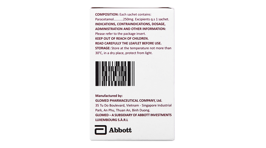 - Tá dược: Đường trắng, sunset yellow dye, hương cam, mannitol 160C, microcrystalline cellulose & carboxymethyl cellulose natri C91, sucralose.